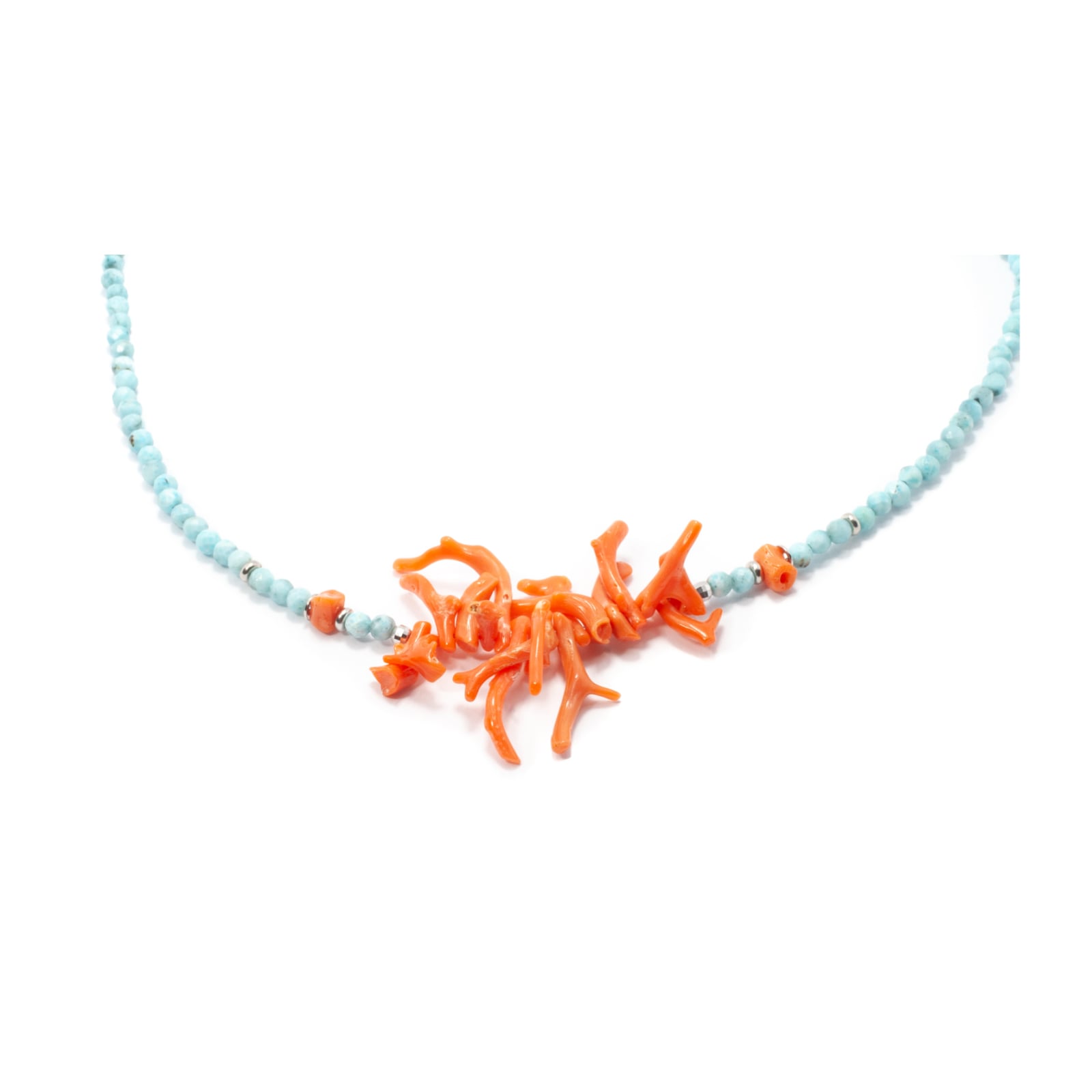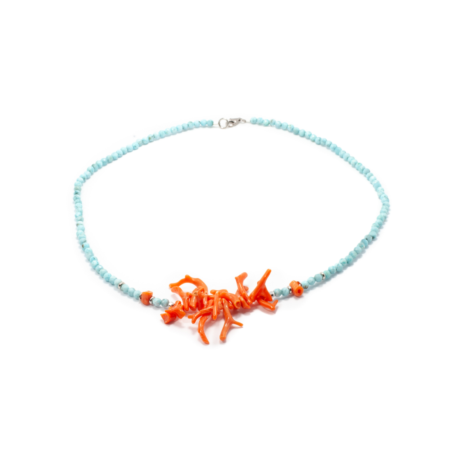 Colier unicat, concept Ioana Condurățeanu, realizat manual în atelierele Sheba din pietre naturale, cu accesorii din argint auriu. Colierul este compus din pietre fațetate de acvamarin de formă sferică și din crenguțe de coral natural în zona centrală. Pietrele sunt înșirate pe suport din oțel filetat acoperit cu peliculă de protecție, special creat pentru confecționarea bijuteriilor. Sistemul de închidere este de tip carabină, discretă și sigură. O bijuterie cu personalitate, potrivită ținutelor de seară sau pentru un accent rafinat peste zi. Pentru a vă accesoriza acest colier vă puteți comanda în funcție de preferințe și ținuta la care doriți să îl purtați, cercei sau brățară în același ton.