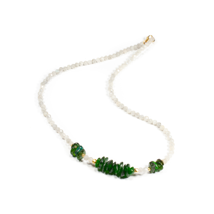 Colier unicat, concept Ioana Condurățeanu, realizat manual în atelierele Sheba din pietre naturale, cu accesorii din argint auriu. Colierul este realizat din pietre fațetate de labradorit de formă sferică și din chipsuri de moldavit. Pietrele sunt înșirate pe suport din oțel filetat acoperit cu peliculă de protecție, special creat pentru confecționarea bijuteriilor. Sistemul de închidere este de tip carabină, discretă și sigură. O bijuterie cu personalitate, potrivită ținutelor de seară sau pentru un accent rafinat peste zi. Pentru a vă accesoriza acest colier vă puteți comanda în funcție de preferințe și ținuta la care doriți să îl purtați, cercei sau brățară în același ton.