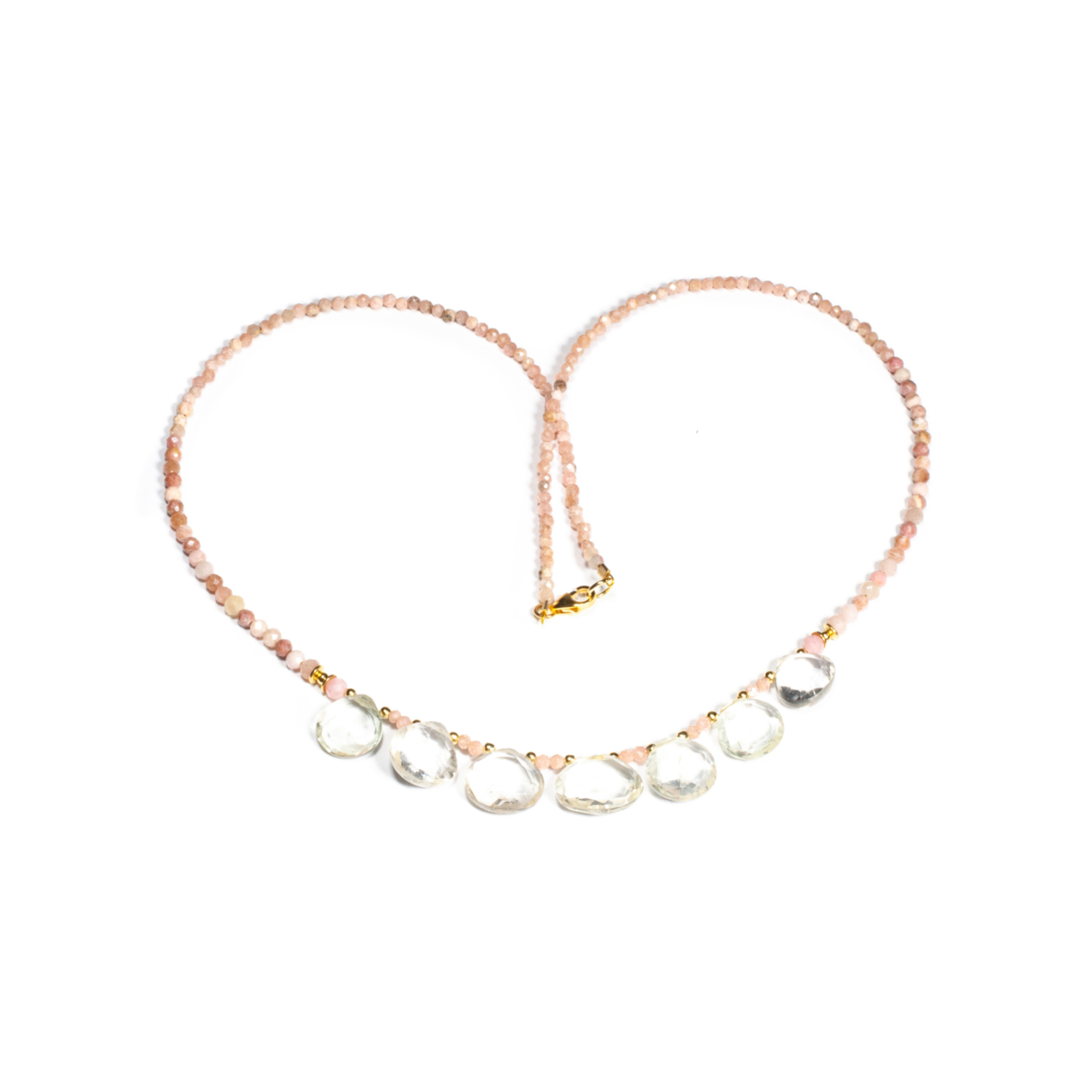Colier unicat, concept Ioana Condurățeanu, realizat manual în atelierele Sheba din pietre naturale, cu accesorii din argint auriu. Colierul este compus din pietre fațetate de opal roz de formă sferică și din pietre fațetate de cuarț de formă lacrimă. Pietrele sunt înșirate pe suport din oțel filetat acoperit cu peliculă de protecție, special creat pentru confecționarea bijuteriilor. Sistemul de închidere este de tip carabină, discretă și sigură. O bijuterie cu personalitate, potrivită ținutelor de seară sau pentru un accent rafinat peste zi. Pentru a vă accesoriza acest colier vă puteți comanda în funcție de preferințe și ținuta la care doriți să îl purtați, cercei sau brățară în același ton.