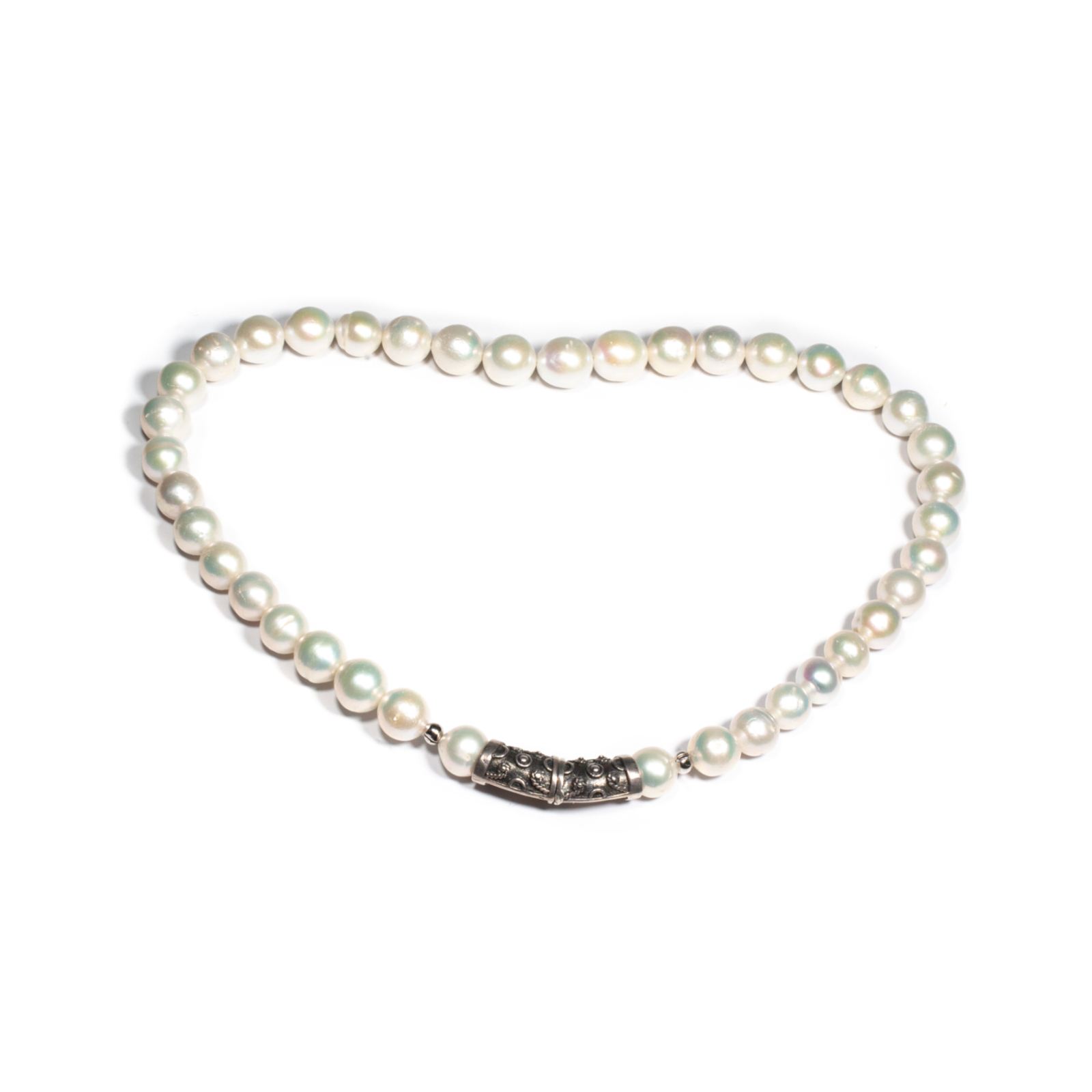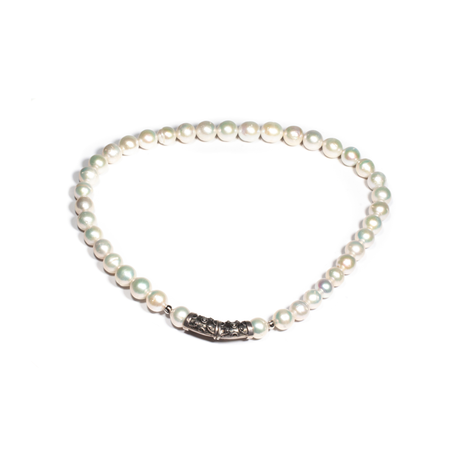 Colier unicat, concept Ioana Condurățeanu, realizat manual în atelierele Sheba din pietre naturale, cu accesorii din argint. Colierul este compus din perle de cultură sferice. O bijuterie ce pune în evidență frumusețea clasică și naturalețea perlelor. Pietrele sunt înșirate pe suport din oțel filetat acoperit cu peliculă de protecție, special creat pentru confecționarea bijuteriilor. Sistemul de închidere robust oferă siguranță și confort. O bijuterie cu personalitate, potrivită ținutelor de seară sau pentru un accent rafinat peste zi. Pentru a vă accesoriza acest colier vă puteți comanda în funcție de preferințe și ținuta la care doriți să îl purtați, cercei sau brățară în același ton.