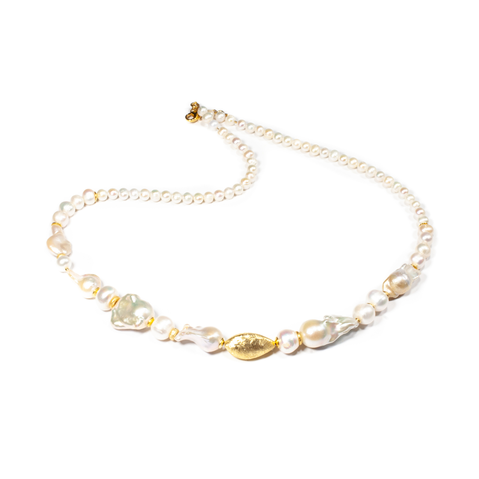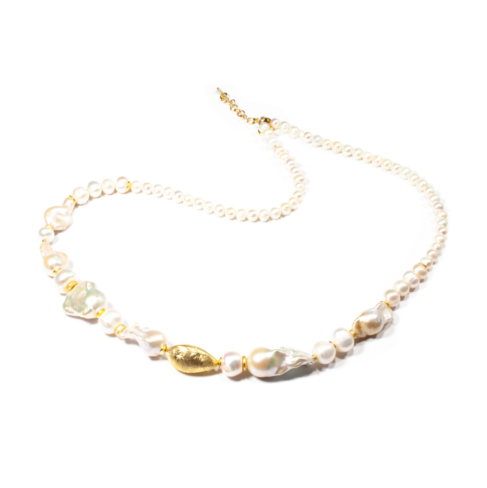Colier unicat, concept Ioana Condurățeanu, realizat manual în atelierele Sheba din pietre naturale, cu accesorii din argint 92,5% provenit din Italia. Colierul este compus din perle de cultură și perle baroc, o combinație elegantă și feminină, în care luciul clasic al perlelor este completat de frumusețea organică și expresivă a perlelor baroc. Perlele sunt înșirate pe suport din oțel filetat acoperit cu peliculă de protecție, special creat pentru confecționarea bijuteriilor. Sistemul de închidere este de tip carabină, discretă și sigură. Colierul are lungimea de 57 cm, la care se adaugă un lanț de prelungire de 3,5 cm, și conține 1,90 g argint. Colierul reprezintă o bijuterie rafinată, luminoasă și elegantă, potrivită atât pentru ținute de zi, cât și pentru apariții speciale. Pentru a vă accesoriza acest colier, vă puteți comanda, în funcție de preferințe și de ținuta la care doriți să îl purtați, o brățară sau cercei în set.