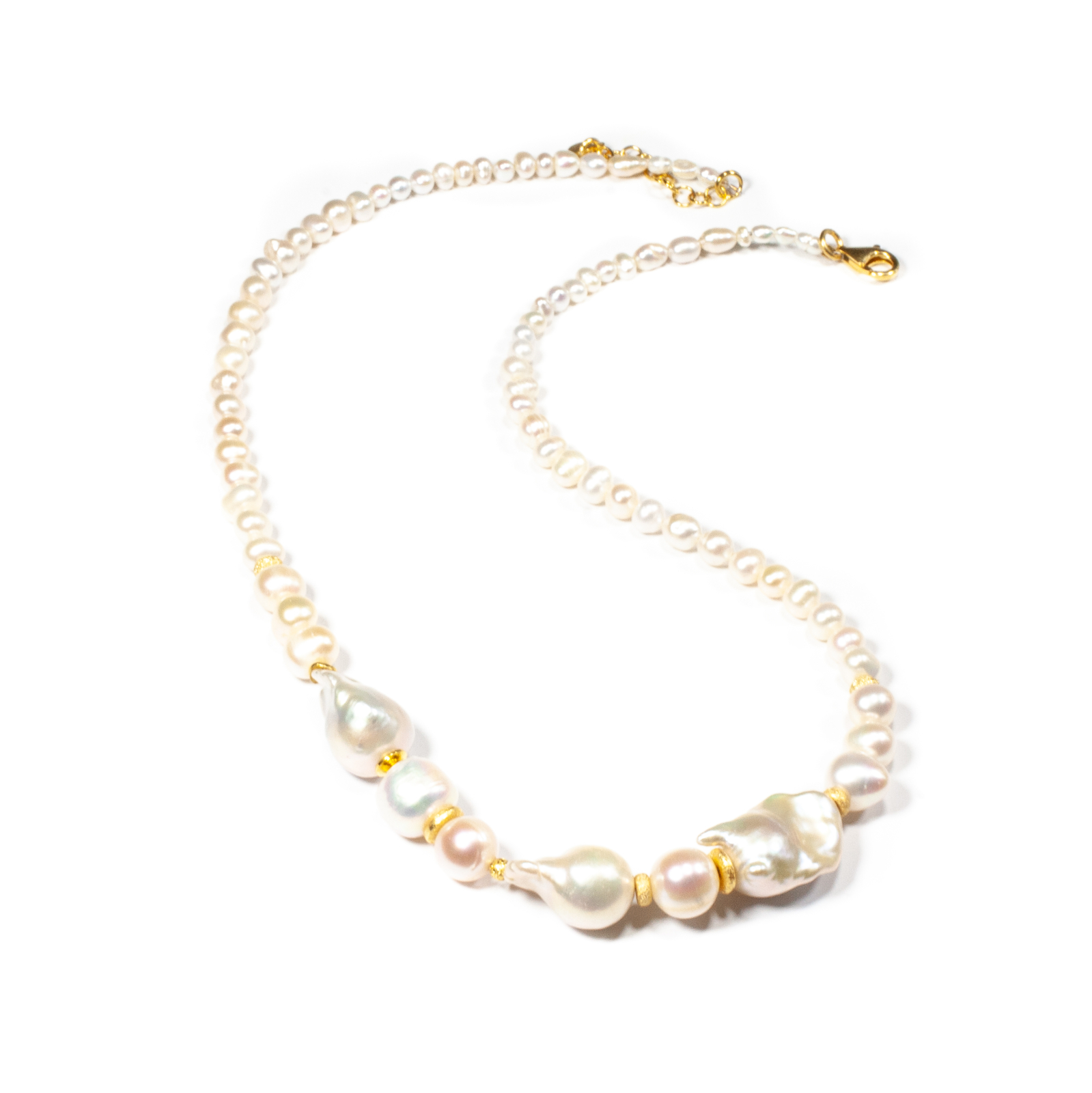 Colier unicat, concept Ioana Condurățeanu, realizat manual în atelierele Sheba din pietre naturale, cu accesorii din argint 92,5% provenit din Italia. Colierul este compus din perle de cultură și perle baroc, atent alese pentru frumusețea lor delicată, luminoasă și naturală. Perlele sunt înșirate pe suport din oțel filetat acoperit cu peliculă de protecție, special creat pentru confecționarea bijuteriilor. Sistemul de închidere este de tip carabină, discretă și sigură. Colierul are lungimea de 45 cm, la care se adaugă un lanț de prelungire de 3,5 cm, și conține 1,50 g argint. Colierul reprezintă o bijuterie rafinată, feminină și elegantă, potrivită atât pentru ținute de zi, cât și pentru apariții mai speciale. Pentru a vă accesoriza acest colier, vă puteți comanda, în funcție de preferințe și de ținuta la care doriți să îl purtați, o brățară sau cercei în set.