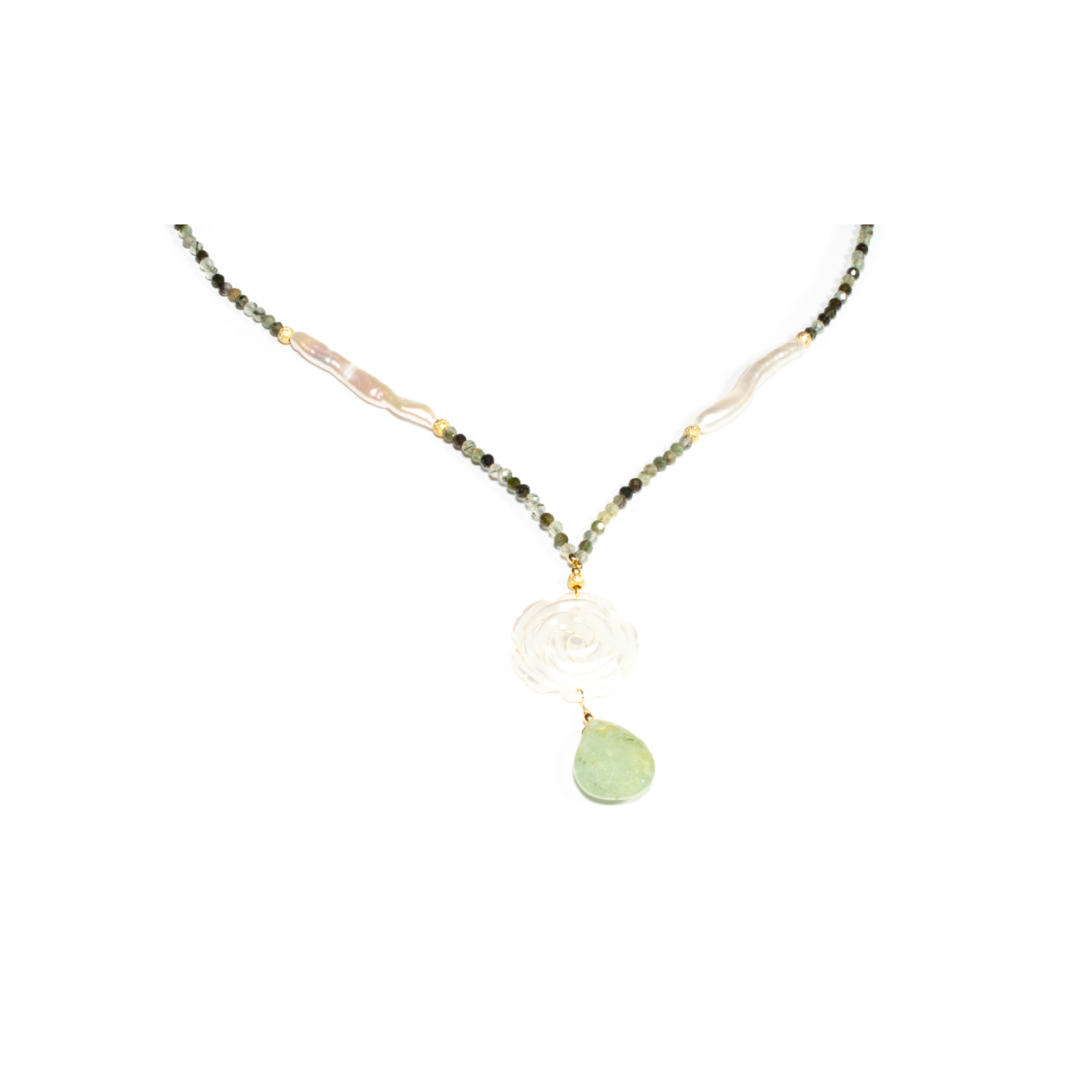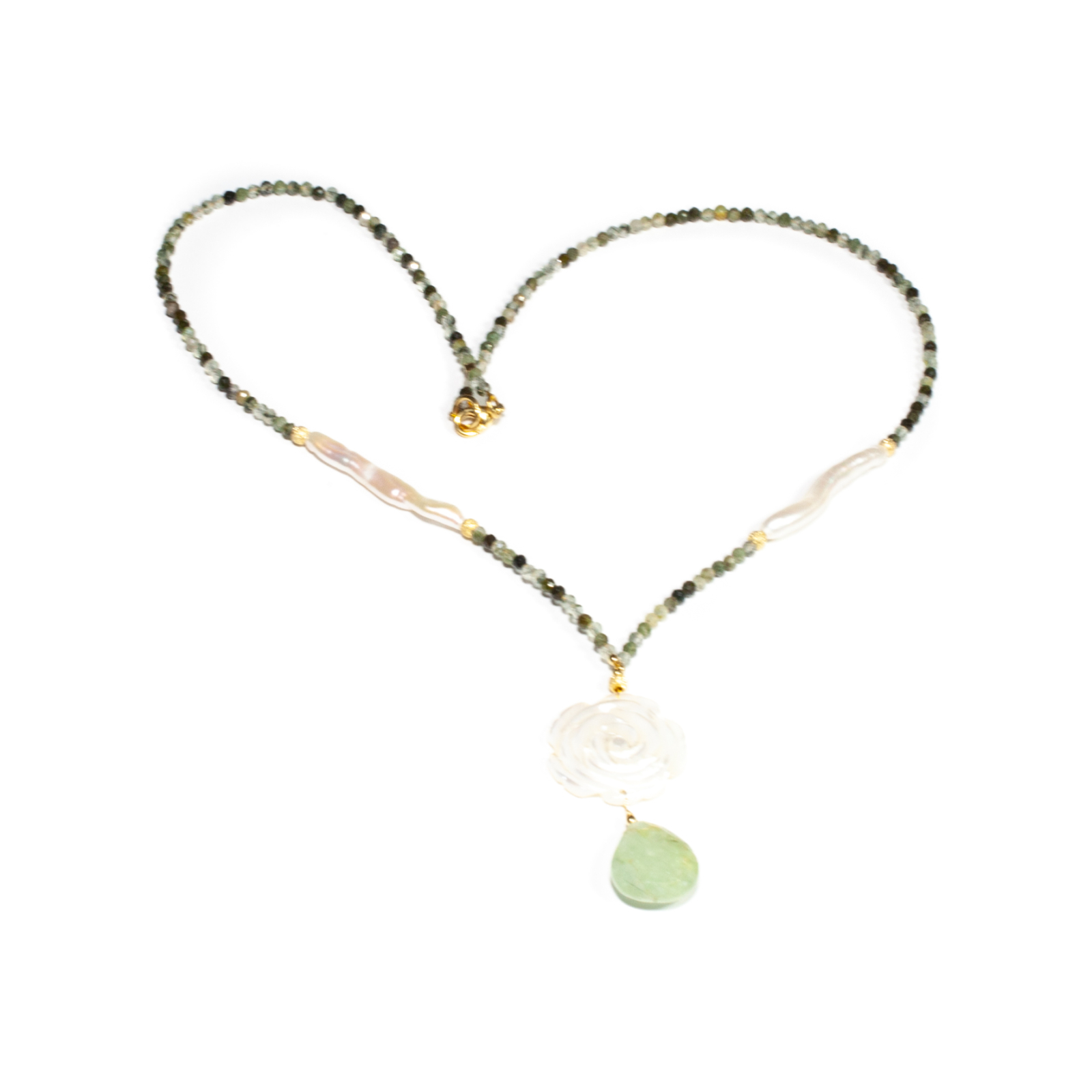 Colier unicat, concept Ioana Condurățeanu, realizat manual în atelierele Sheba din pietre naturale, cu accesorii din argint auriu. Colierul este realizat din pietre fațetate sferice de prehnit, completate de două perle de cultură alungite care adaugă un contrast subtil și o notă de eleganță clasică. În zona centrală colierul conține un trandafir din sidef și o piatră fațetată de prehnit de formă lacrimă. Accesoriile din argint completează armonios designul, conferind bijuteriei un aspect sofisticat și feminin. Pietrele sunt înșirate pe suport din oțel filetat acoperit cu peliculă de protecție, special creat pentru confecționarea bijuteriilor. Sistemul de închidere este de tip carabină, discretă și sigură. O bijuterie cu personalitate, potrivită ținutelor de seară sau pentru un accent rafinat peste zi. Pentru a vă accesoriza acest colier vă puteți comanda în funcție de preferințe și ținuta la care doriți să îl purtați, cercei sau brățară în același ton.