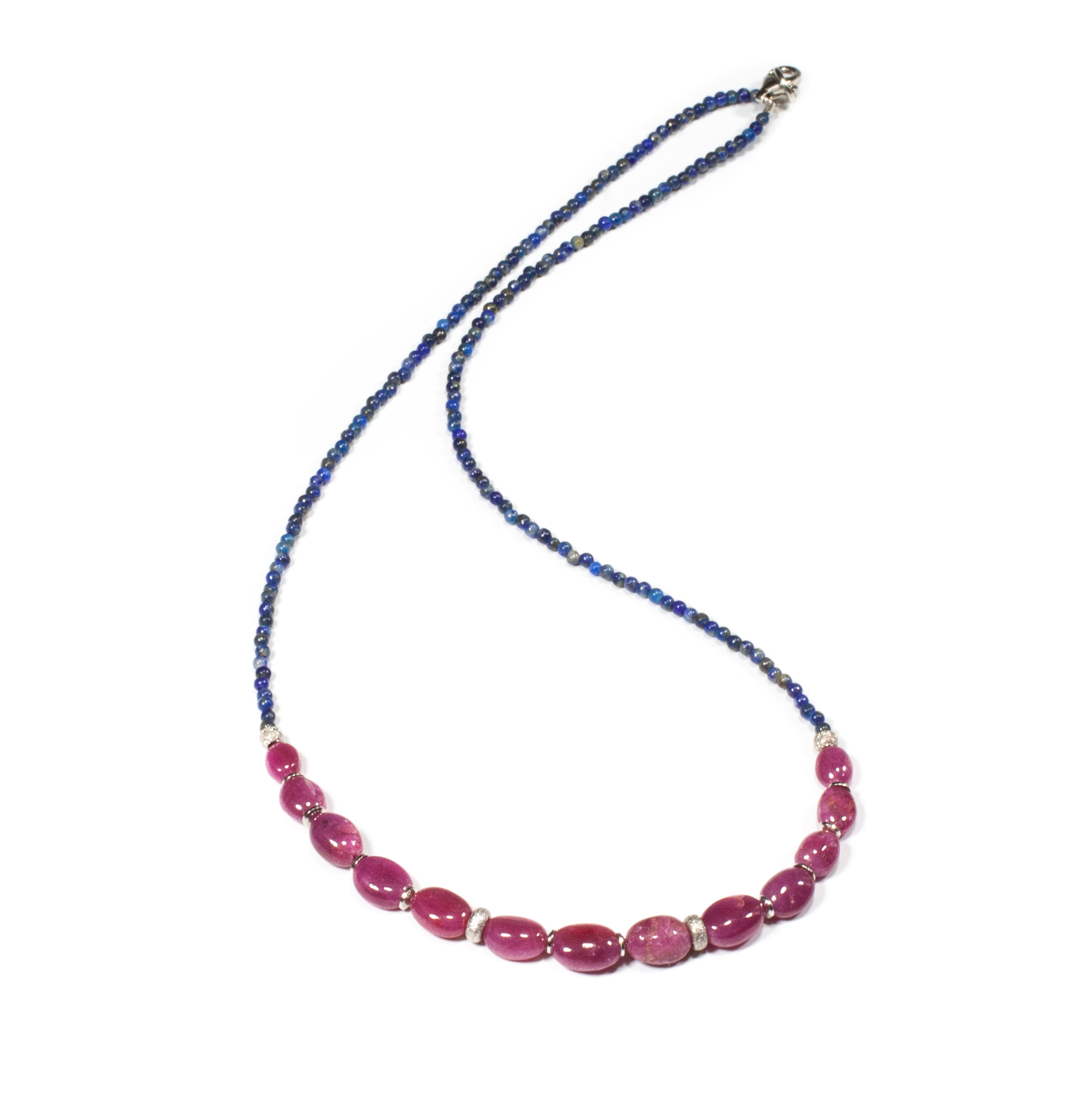 Colier unicat, concept Ioana Condurățeanu, realizat manual în atelierele Sheba din pietre naturale, cu accesorii din argint 92,5% provenit din Italia. Colierul este compus din rubin și lapislazuli, două pietre naturale prețioase prin expresivitatea lor cromatică, atent alese pentru contrastul elegant dintre roșul intens al rubinului și albastrul profund al lapislazuliului. Pietrele sunt înșirate pe suport din oțel filetat acoperit cu peliculă de protecție, special creat pentru confecționarea bijuteriilor. Sistemul de închidere este de tip carabină, discretă și sigură. Colierul are lungimea de 42,5 cm și conține 1,30 g argint. Colierul reprezintă o bijuterie rafinată, spectaculoasă și plină de personalitate, potrivită pentru a adăuga o notă distinctivă oricărei ținute. Pentru a vă accesoriza acest colier, vă puteți comanda, în funcție de preferințe și de ținuta la care doriți să îl purtați, o brățară sau cercei în set.