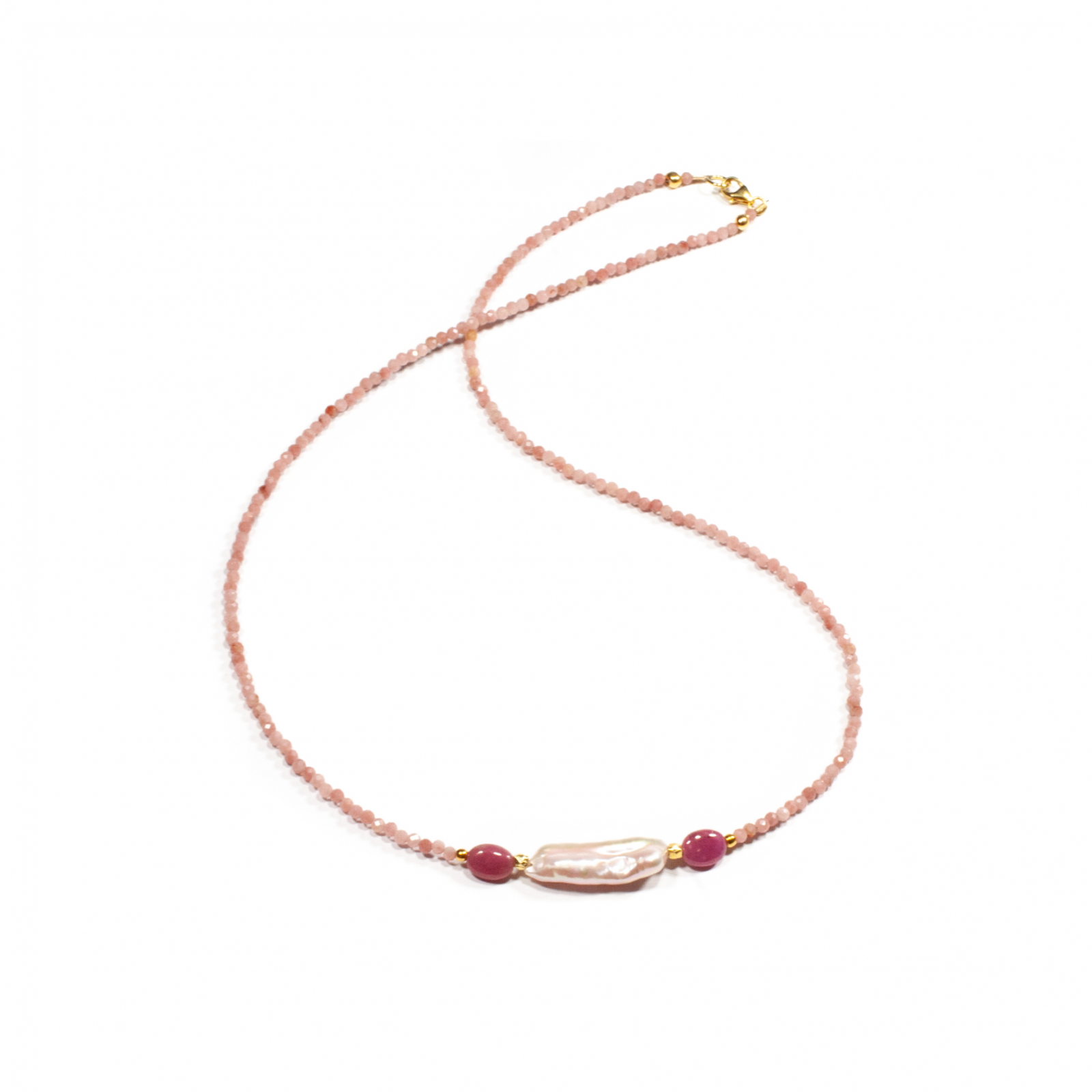 Colier unicat, concept Ioana Condurățeanu, realizat manual în atelierele Sheba din pietre naturale, cu accesorii din argint de culoare aurie. Colierul conține pietre fațetate de turmalină de formă sferică, pietre cu tăietură caboșon de turmalină de formă ovală și o perlă de cultură baroc. Pietrele sunt înșirate pe suport din oțel filetat acoperit cu peliculă de protecție, special creat pentru confecționarea bijuteriilor. Sistemul de închidere este de tip carabină, discretă și sigură. O bijuterie cu personalitate, potrivită ținutelor de seară sau pentru un accent rafinat peste zi. Pentru a vă accesoriza acest colier vă puteți comanda în funcție de preferințe și ținuta la care doriți să îl purtați, cercei sau brățară în set.