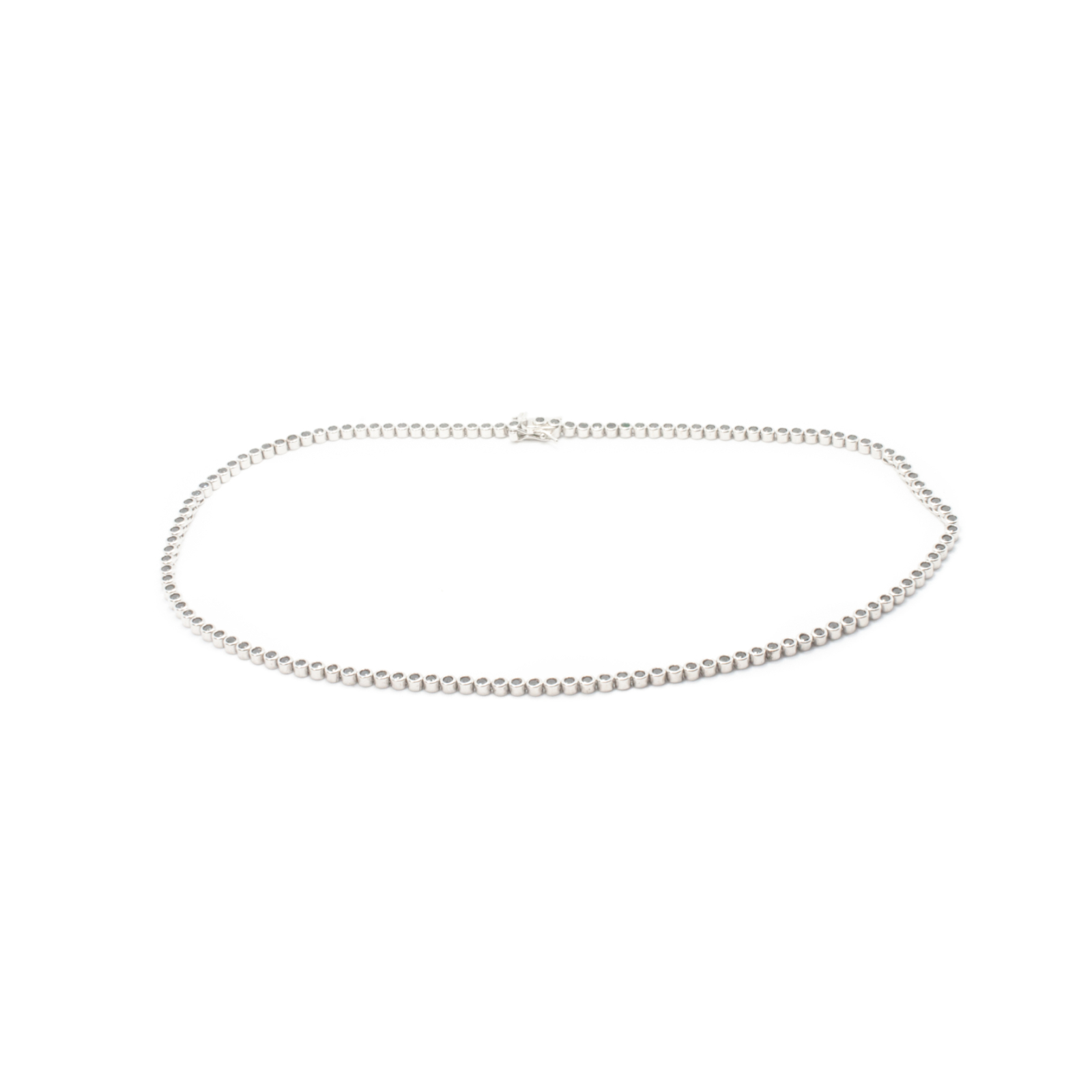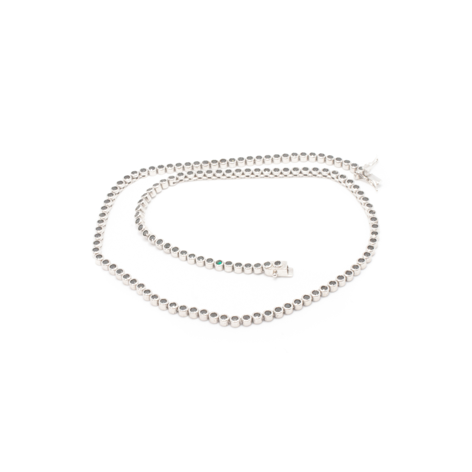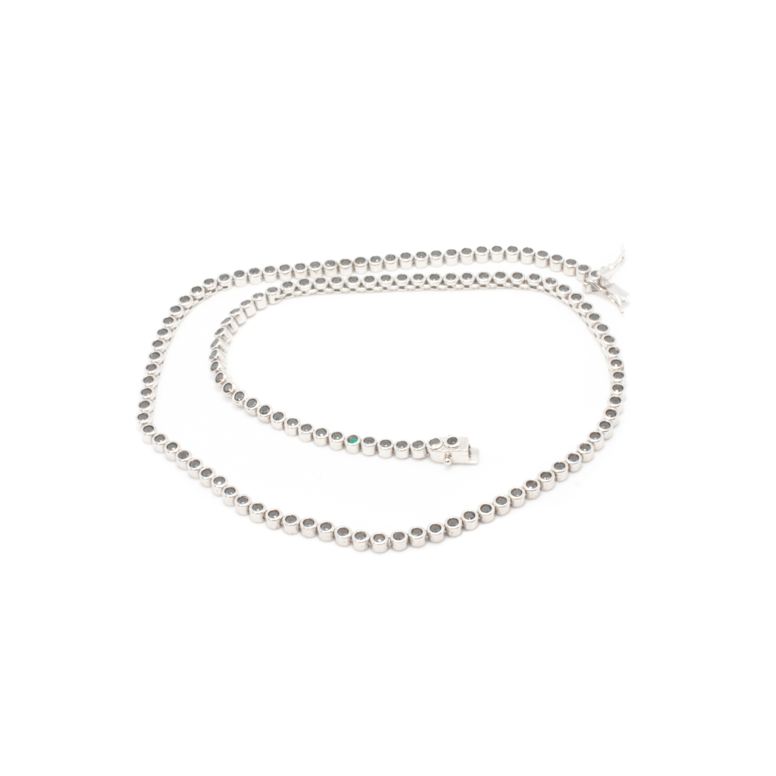 Colier realizat din argint rodiat cu pietre de zirconiu. Colierul este compus din pietre fațetate de zirconiu de culoare albă, de formă rotundă, încasetate pe contur. Modelul și finisajul impecabil executat manual, cu mare atenție la detalii, scoate în evidență strălucirea și culoarea minunată a pietrelor. Este un colier fin, elegant și rafinat. Puteți solicita ajutorul consilierilor Sheba pentru a comanda brăţară, inel sau cercei în set, în limita disponibilității.