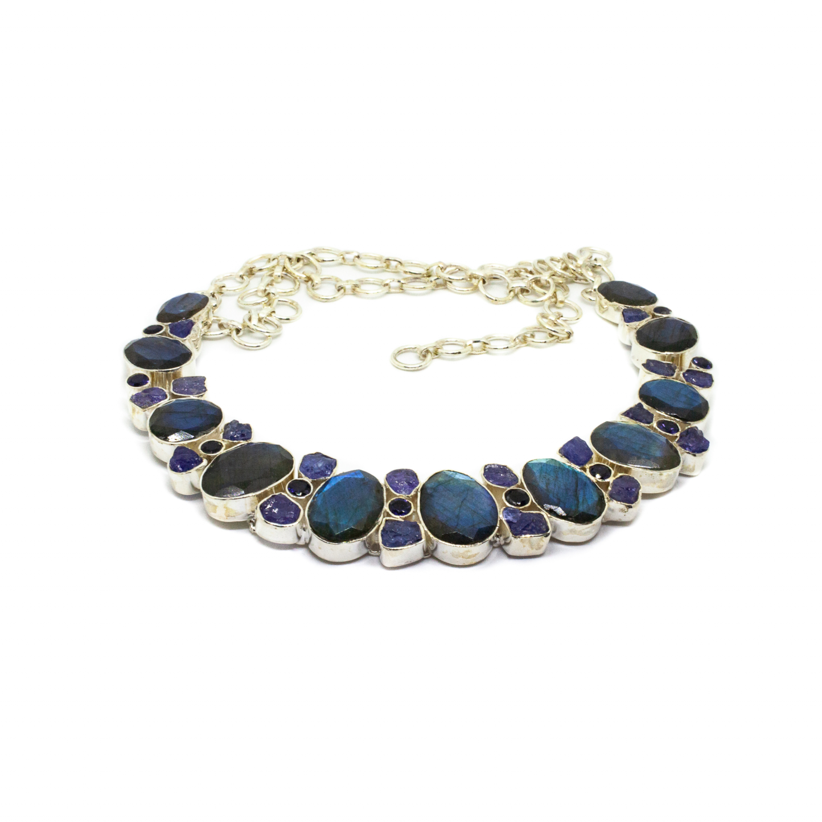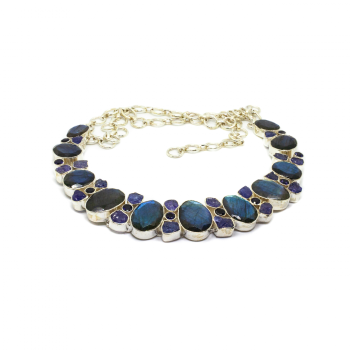 Colier unicat din argint cu labradorit și tanzanită. Colierul este compus din pietre fațetate de labradorit de formă ovală și din pietre brute de tanzanit de formă neregulată, încasetate în argint. Modelul și finisajul impecabil este executat manual, cu mare atenție la detalii, urmărind perfect conturul pietrei și scoate în evidență strălucirea și transparența minunată a pietrelor. Montura este special concepută pentru ca pietrele să vină în contact direct cu posesoarea bijuteriei, astfel încât aceasta să beneficieze la maxim de energia cristalelor. Este un colier statement, elegant și spectaculos.