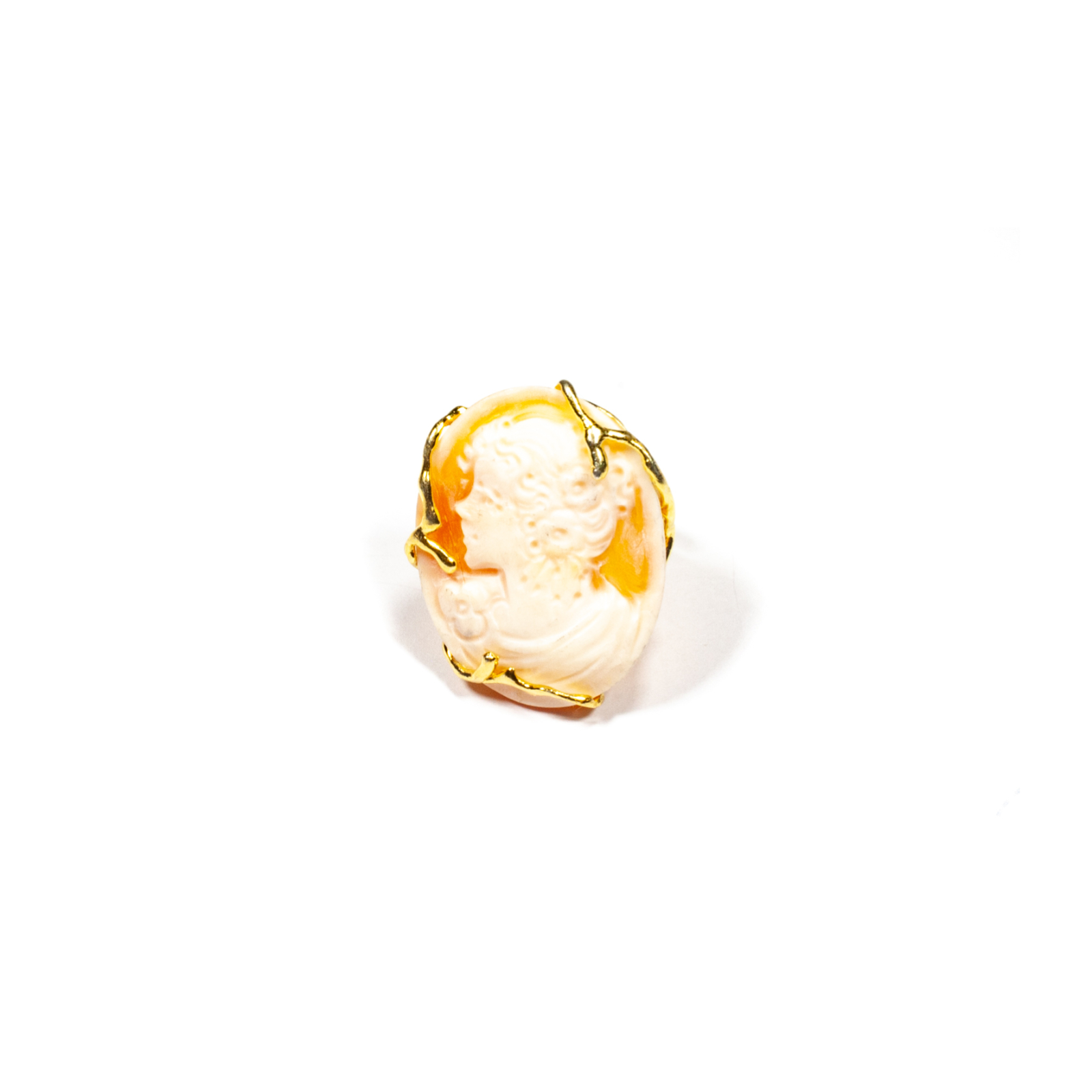Inel cu camee lucrată manual, pe scoică specială. Motura din argint auriu este executată urmărind perfect forma cameei, oferindu-i strălucire şi eleganţă, fără a concura cu splendoarea cameei. Cameele sunt scoici sculptate în relief, lucrate în miniatură. Acestea înfățișează portretul unei femei sau al unui zeu/ zeițe din mitologia greacă, ori romană. Ulterior au apărut motivele florale. Datorită frumuseții și eleganței, cameele au inspirat scriitori și sunt apreciate pentru farmecul lor și în zilele noastre. Pentru un ansamblu complet, puteți opta pentru cercei sau pandantiv asortat, disponibile în colecțiile Sheba.