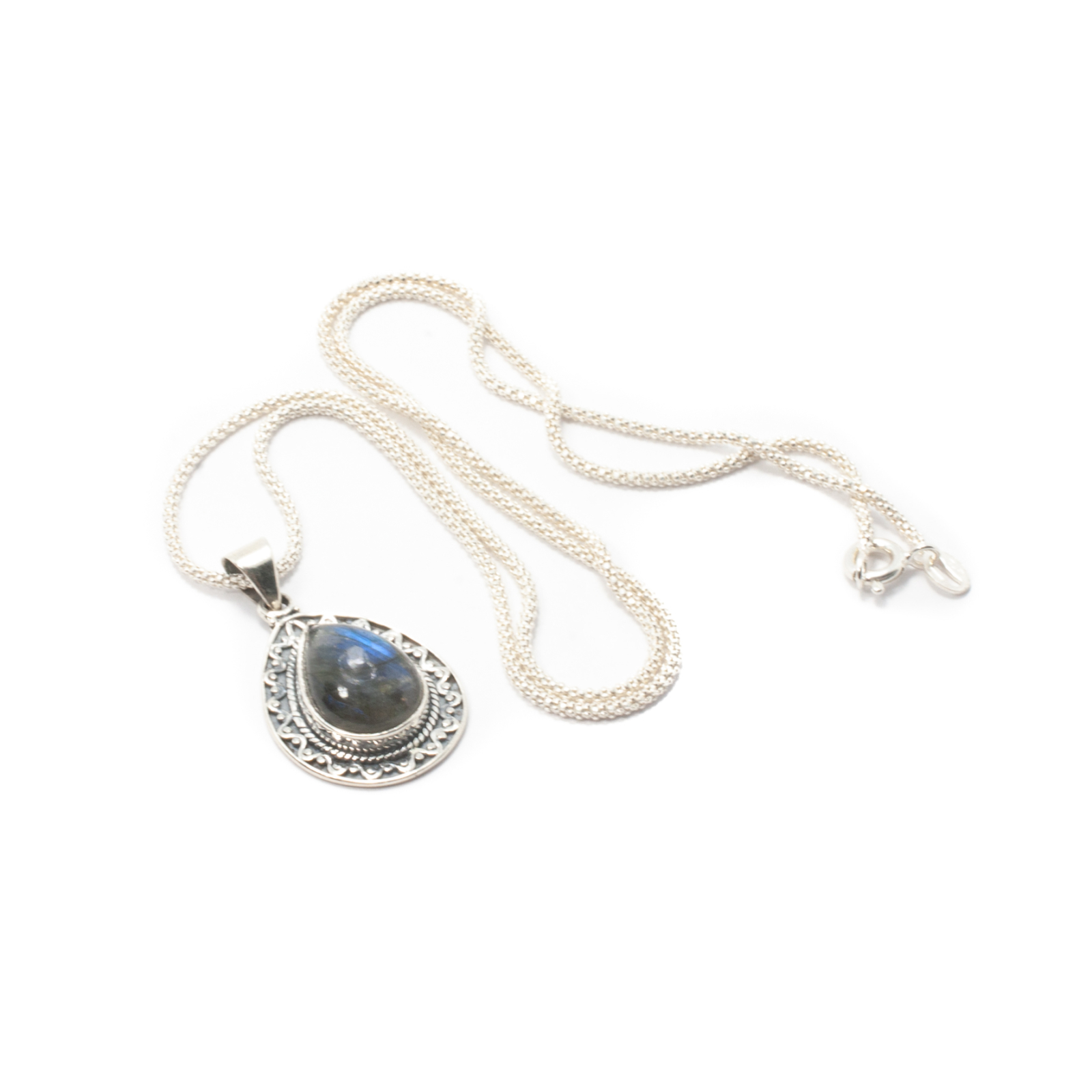 Lanț și pandantiv din argint cu labradorit. Lanțul lucrat cu măiestrie conține un pandantiv din argint patinat cu piatră cu tăietură caboșon de labradorit de formă lacrimă. Închiderea este de tip carabină, discretă și sigură. Modelul și finisajul impecabil îl recomandă pentru o diversitate de ținute, fiind modern și rafinat. Pentru un efect stilistic complet, puteți accesoriza acest lanț cu cercei sau o brățară în același ton.