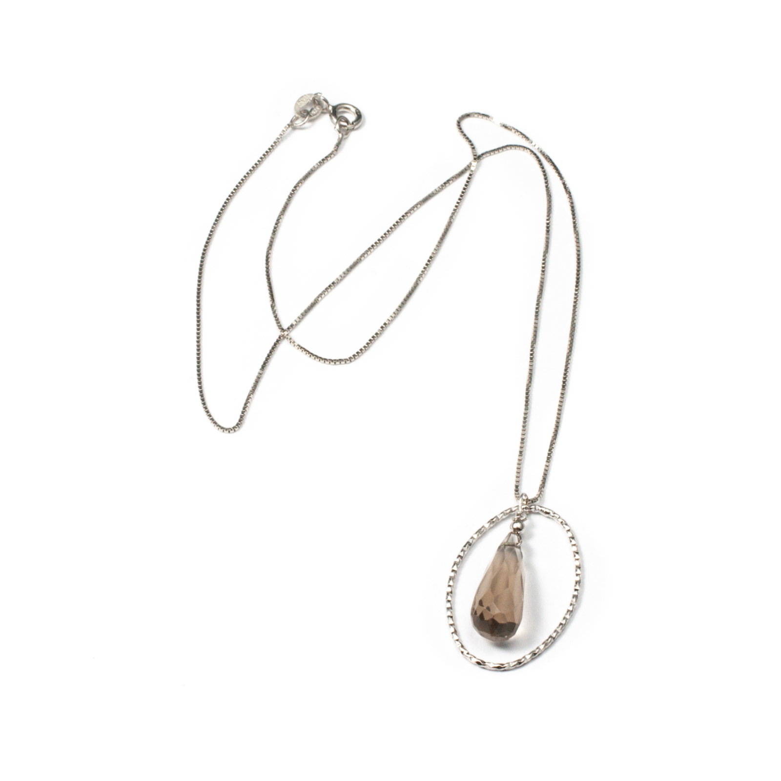 Acest lanț delicat din argint rodiat lucrat cu măiestrie conține un pandantiv compus dintr-o piatră fațetată de cuarț fumuriu de formă lacrimă suspendată de un cerc texturat din argint, pentru un contrast subtil de texturi, creând o bijuterie fină și rafinată. Pandantivul este confecționat manual în atelierele Sheba. Închiderea este de tip carabină, discretă și sigură. Pentru un efect stilistic complet, puteți accesoriza acest lanț cu cercei sau o brățară în același ton.
