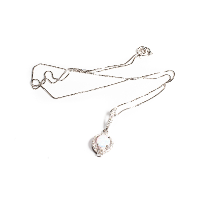 Pandantiv și lanț din argint. Pandantivul conține o piatră cu tăietură caboșon de opal de formă rotundă, prinsă în gheruțe și mici zirconii fațetate. Lanțul delicat din argint rodiat model "Veneziana Diamantata" este lucrat cu măiestrie. Sistemul de închidere este de tip carabină, discretă și sigură. Modelul și finisajul impecabil îl recomandă pentru o diversitate de ținute, fiind modern și rafinat. Pentru un efect stilistic complet, puteți accesoriza acest lanț cu cercei sau o brățară în același ton.