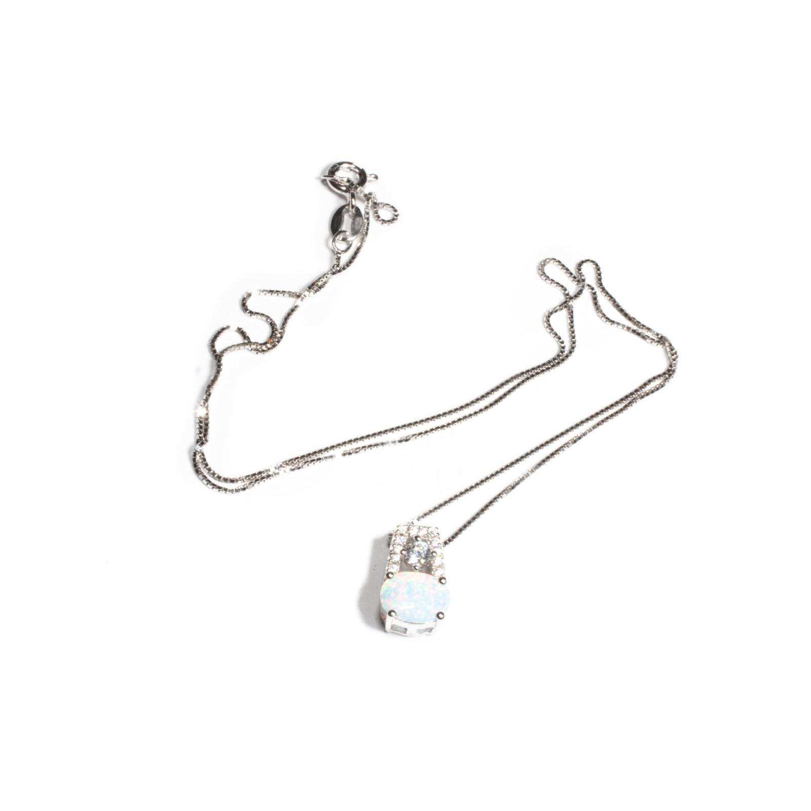 Pandantiv și lanț din argint. Pandantivul conține o piatră cu tăietură caboșon de opal de formă ovală, prinsă în gheruțe și mici zirconii fațetate. Lanțul delicat din argint rodiat model "Veneziana Diamantata" este lucrat cu măiestrie. Sistemul de închidere este de tip carabină, discretă și sigură. Modelul și finisajul impecabil îl recomandă pentru o diversitate de ținute, fiind modern și rafinat. Pentru un efect stilistic complet, puteți accesoriza acest lanț cu cercei sau o brățară în același ton.