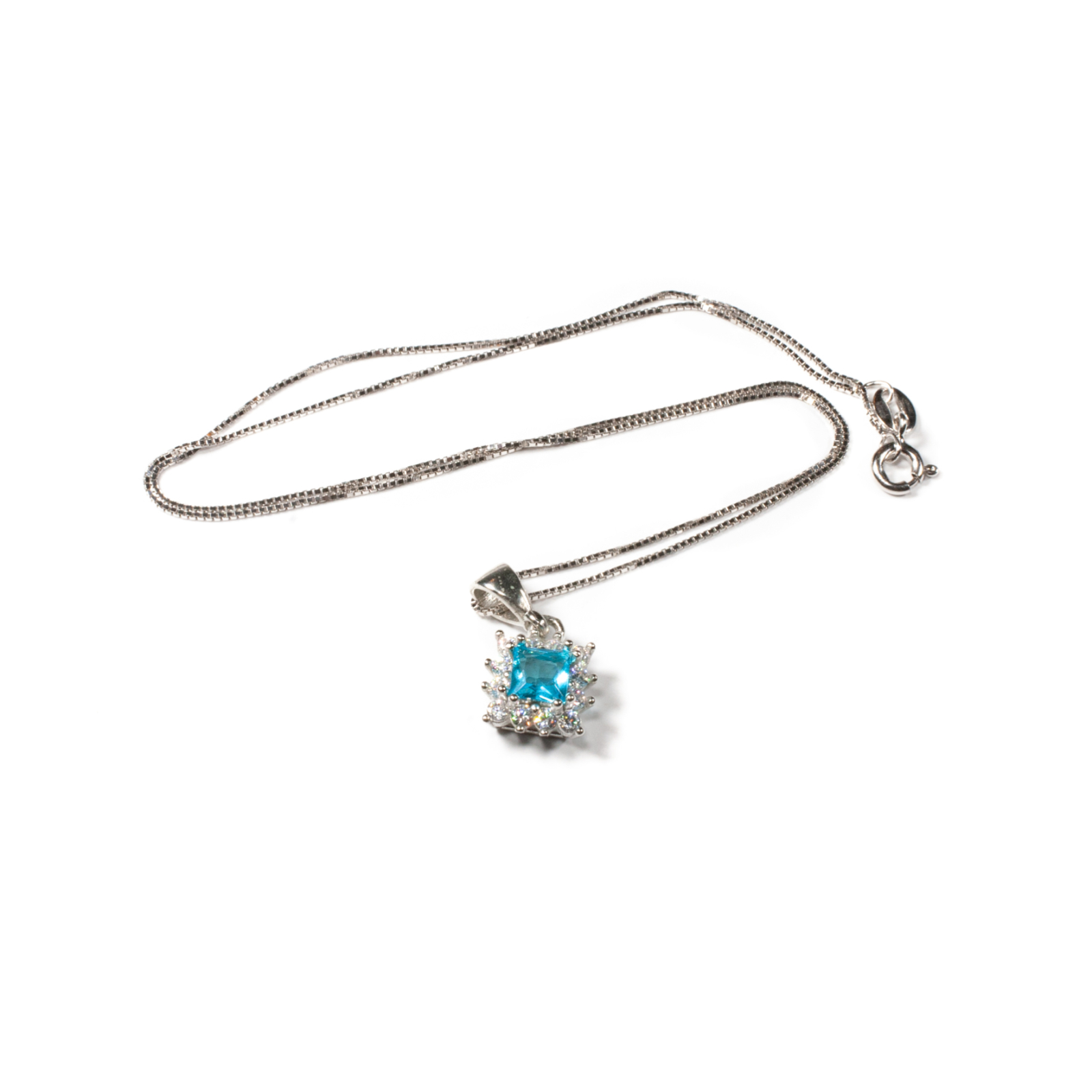 Pandantiv și lanț din argint. Pandantivul conține pietre fațetate de zirconiu de formă rectangulară și rotundă, prinse în gheruțe. Lanțul delicat din argint rodiat model "Veneziana Diamantata" este lucrat cu măiestrie. Sistemul de închidere este de tip carabină, discretă și sigură. Modelul și finisajul impecabil îl recomandă pentru o diversitate de ținute, fiind modern și rafinat. Pentru un efect stilistic complet, puteți accesoriza acest lanț cu cercei sau o brățară în același ton.