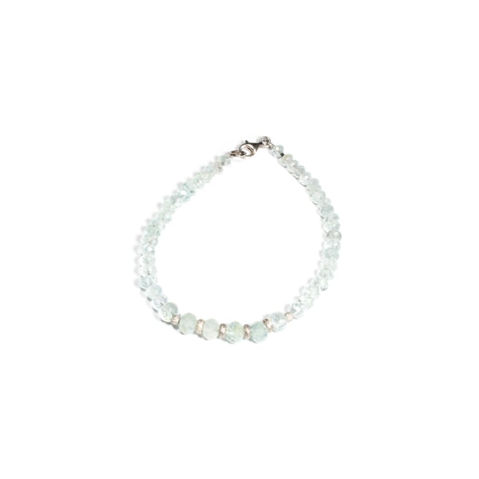Brățară realizată manual în atelierele Sheba din pietre naturale, cu accesorii din argint. Brățara este realizată din pietre fațetate de acvamarin de formă sferă turtită. Pietrele sunt înșirate pe suport din oțel filetat acoperit cu peliculă de protecție, special creat pentru confecționarea bijuteriilor. Sistemul de prindere este tip carabină și la cerere se poate adăuga un lănțișor de prelungire. O bijuterie cu personalitate, potrivită ținutelor de seară sau pentru un accent rafinat peste zi. Pentru a vă accesoriza această brățară vă puteți comanda în funcție de preferințe și de ținuta la care doriți să o purtați, cercei sau colier în set.