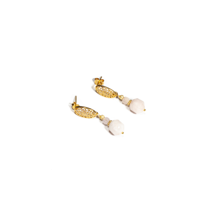 Cercei unicat, concept Ioana Condurățeanu, realizați manual în atelierele Sheba din pietre naturale, cu accesorii din argint auriu. Cerceii sunt compuși din pietre fațetate de cuarț roz suspendate sub o tortiță specială de formă ovală. Cerceii sunt prevăzuți cu sistem de prindere pe ureche tip tijă cu fluturaș, astfel se așază perfect pe lob și sunt comozi de purtat. Bijuteria oferă o notă de serenitate și rafinament, potrivită atât pentru ținute smart-casual, cât și pentru evenimente elegante. Puteți cere ajutorul consilierilor Sheba pentru a vă comanda, în funcție de preferințe și de ținuta la care doriți să îi purtați, un pandantiv potrivit.
