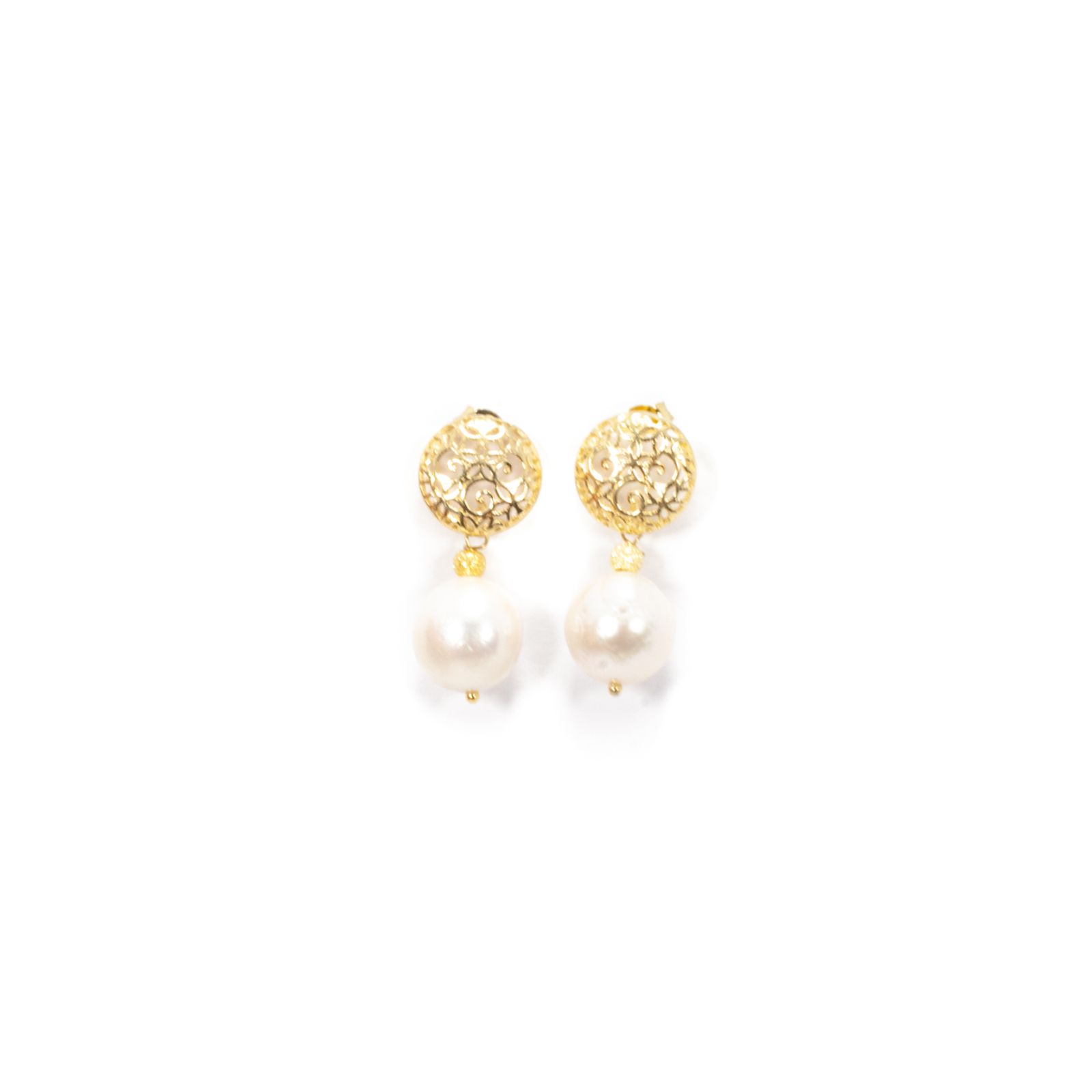 Cercei unicat, concept Ioana Condurățeanu, realizați manual în atelierele Sheba din pietre naturale, cu accesorii din argint auriu. Cerceii sunt compuși din perle de cultură de formă sferică, suspendate sub o tortiță grațioasă din argint auriu. Cerceii sunt prevăzuți cu sistem de prindere pe ureche de tip tijă cu fluturaș, astfel se așază perfect pe lob și lasă piatra să se miște lejer. Bijuteria oferă o notă de serenitate și rafinament, potrivită atât pentru ținute smart-casual, cât și pentru evenimente elegante. Puteți cere ajutorul consilierilor Sheba pentru a vă comanda, în funcție de preferințe și de ținuta la care doriți să îi purtați, un pandantiv potrivit.