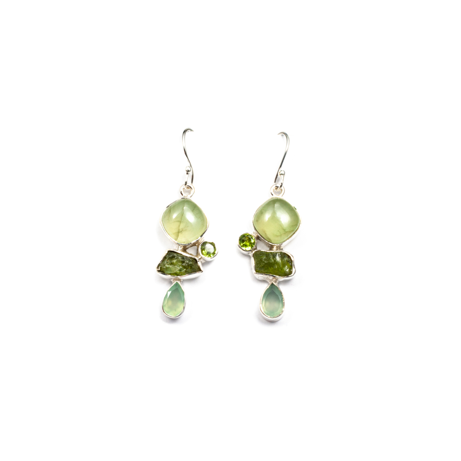 Cerceii confecționați din argint conțin pietre cu tăietură caboșon de prehnit, de formă aproximativ rotundă, pietre fațetate de calcedonie de formă lacrimă și pietre fațetate de peridot de formă rotundă, încasetate pe contur. Accentul este oferit de piatra gemă, nefinisată, de turmalină ce aduce compoziției o notă de prospețime. Modelul și finisajul simplu și elegant este realizat pe conturul pietrelor, pentru a le scoate în evidență culoarea și strălucirea. Cerceii sunt prevăzuți cu sistem de prindere pe ureche tip tortiță deschisă, astfel se așază perfect pe lob și sunt comod de purtat. Pentru un ansamblu complet, puteți opta pentru brățară sau colier asortate, disponibile în colecțiile Sheba.