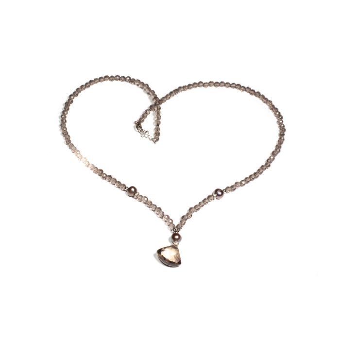 Colier unicat, concept Ioana Condurățeanu, realizat manual în atelierele Sheba din pietre naturale, cu accesorii din argint. Colierul este compus din pietre fațetate de cuarț fumuriu de formă sferică și triunghiulară și din perle de cultură sferice. Pietrele sunt înșirate pe suport din oțel filetat acoperit cu peliculă de protecție, special creat pentru confecționarea bijuteriilor. Sistemul de închidere este de tip carabină, discretă și sigură. Colierul se poate ajusta ca lungime având lanț de prelungire, pentru a se putea adapta perfect în funcție de preferința dumneavoastră. Colierul reprezintă o bijuterie fină și elegantă, plină de energie și culoare. Pentru a vă accesoriza acest colier vă puteți comanda în funcție de preferințe și ținuta la care doriți să îl purtați, cercei sau brățară în set.