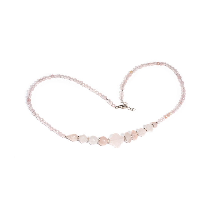 Colier unicat, concept Ioana Condurățeanu, realizat manual în atelierele Sheba din pietre naturale, cu accesorii din argint. Colierul este realizat din pietre fațetate și cu tăietură caboșon de cuarț roz de formă sferică, sferă turtită și floare. Este un colier cu personalitate, rafinat și diafan, potrivit pentru ocazii elegante sau pentru a aduce o notă subtilă de feminitate în ținutele de zi. Pietrele sunt înșirate pe suport din oțel filetat acoperit cu peliculă de protecție, special creat pentru confecționarea bijuteriilor. Sistemul de închidere este de tip carabină, discretă și sigură. Pentru a vă accesoriza acest colier vă puteți comanda în funcție de preferințe și ținuta la care doriți să îl purtați, cercei sau brățară în același ton.