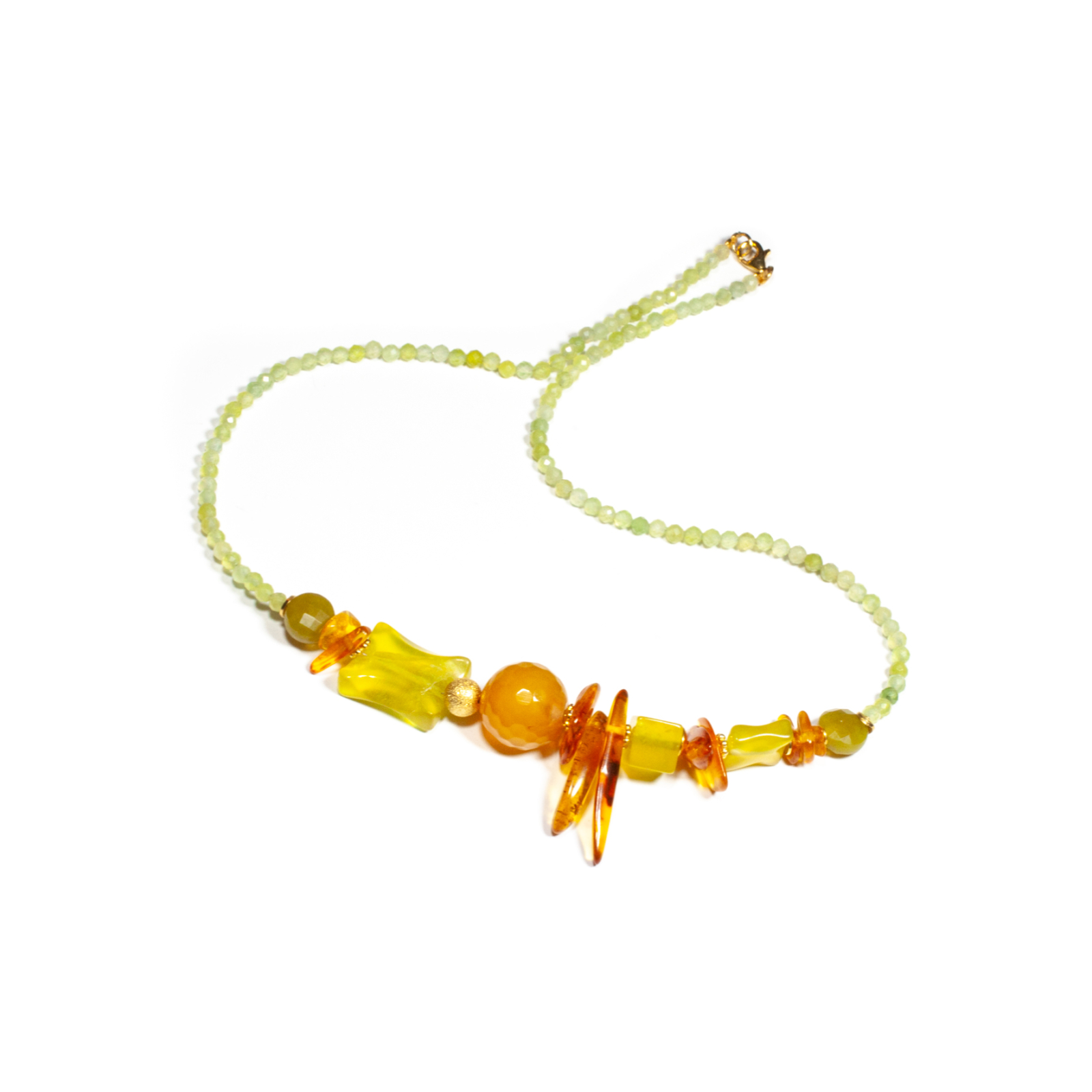 Colier unicat, concept Ioana Condurățeanu, realizat manual în atelierele Sheba din pietre naturale, cu accesorii din argint auriu. Colierul este compus din pietre fațetate de jad de formă sferică, din chipsuri de chihlimbar și din pietre cu tăietură caboșon de prehnit de formă cilindrică. Accesoriile din argint auriu completează armonios designul, conferind bijuteriei un aspect sofisticat și feminin. Pietrele sunt înșirate pe suport din oțel filetat acoperit cu peliculă de protecție, special creat pentru confecționarea bijuteriilor. Sistemul de închidere este de tip carabină, discretă și sigură. O bijuterie cu personalitate, potrivită ținutelor de seară sau pentru un accent rafinat peste zi. Pentru a vă accesoriza acest colier vă puteți comanda în funcție de preferințe și ținuta la care doriți să îl purtați, cercei sau brățară în același ton.