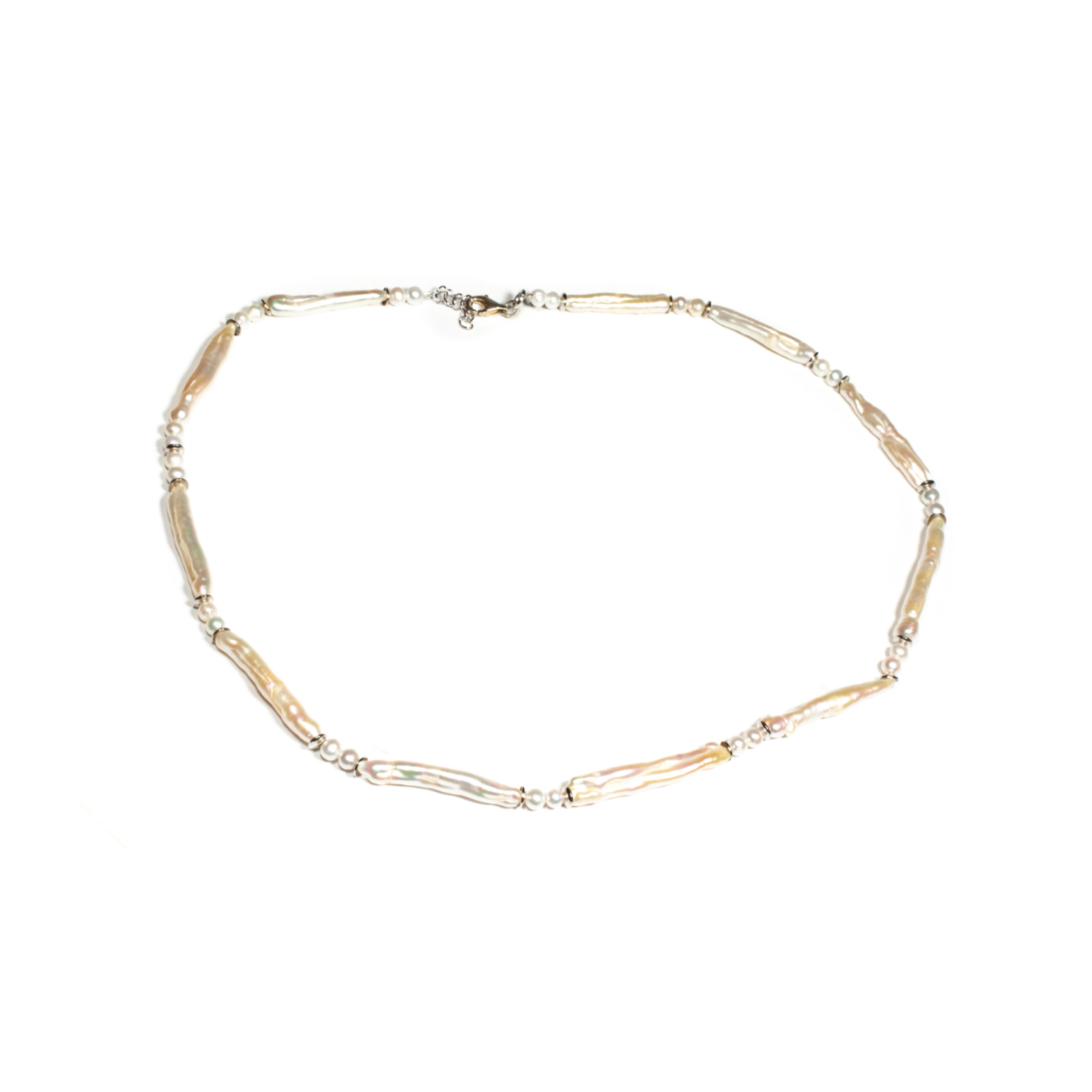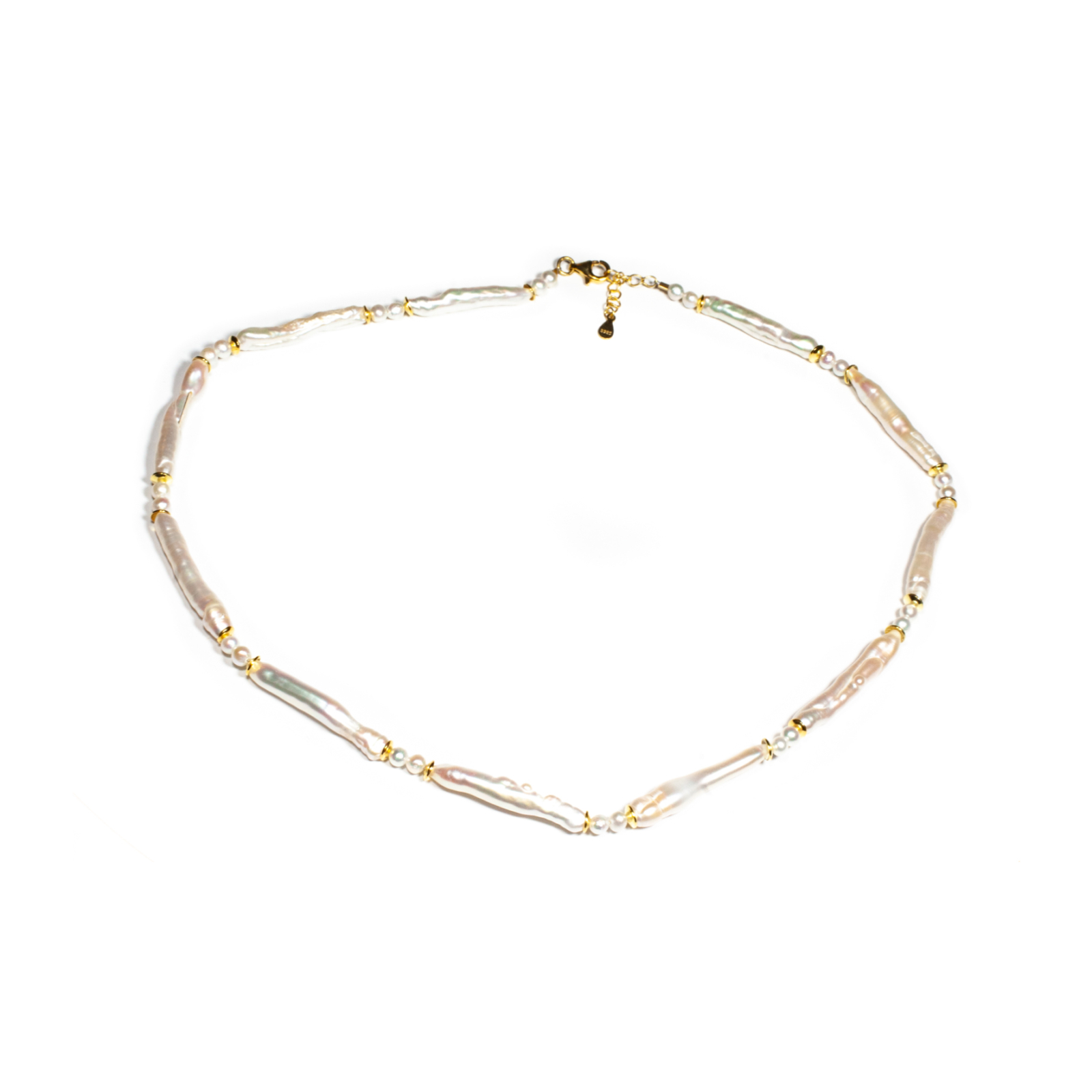 Colier unicat, concept Ioana Condurățeanu, realizat manual în atelierele Sheba din pietre naturale, cu accesorii din argint. Colierul este realizat din perle de cultură de formă alungită separate de mici perle sferice care adaugă un contrast subtil și o notă de eleganță clasică. Accesoriile din argint completează armonios designul, conferind bijuteriei un aspect sofisticat și feminin. Pietrele sunt înșirate pe suport din oțel filetat acoperit cu peliculă de protecție, special creat pentru confecționarea bijuteriilor. Sistemul de închidere este de tip carabină, discretă și sigură. Colierul se poate ajusta ca lungime având lanț de prelungire, pentru a se putea adapta perfect în funcție de preferința dumneavoastră. O bijuterie cu personalitate, potrivită ținutelor de seară sau pentru un accent rafinat peste zi. Pentru a vă accesoriza acest colier vă puteți comanda în funcție de preferințe și ținuta la care doriți să îl purtați, cercei sau brățară în același ton.