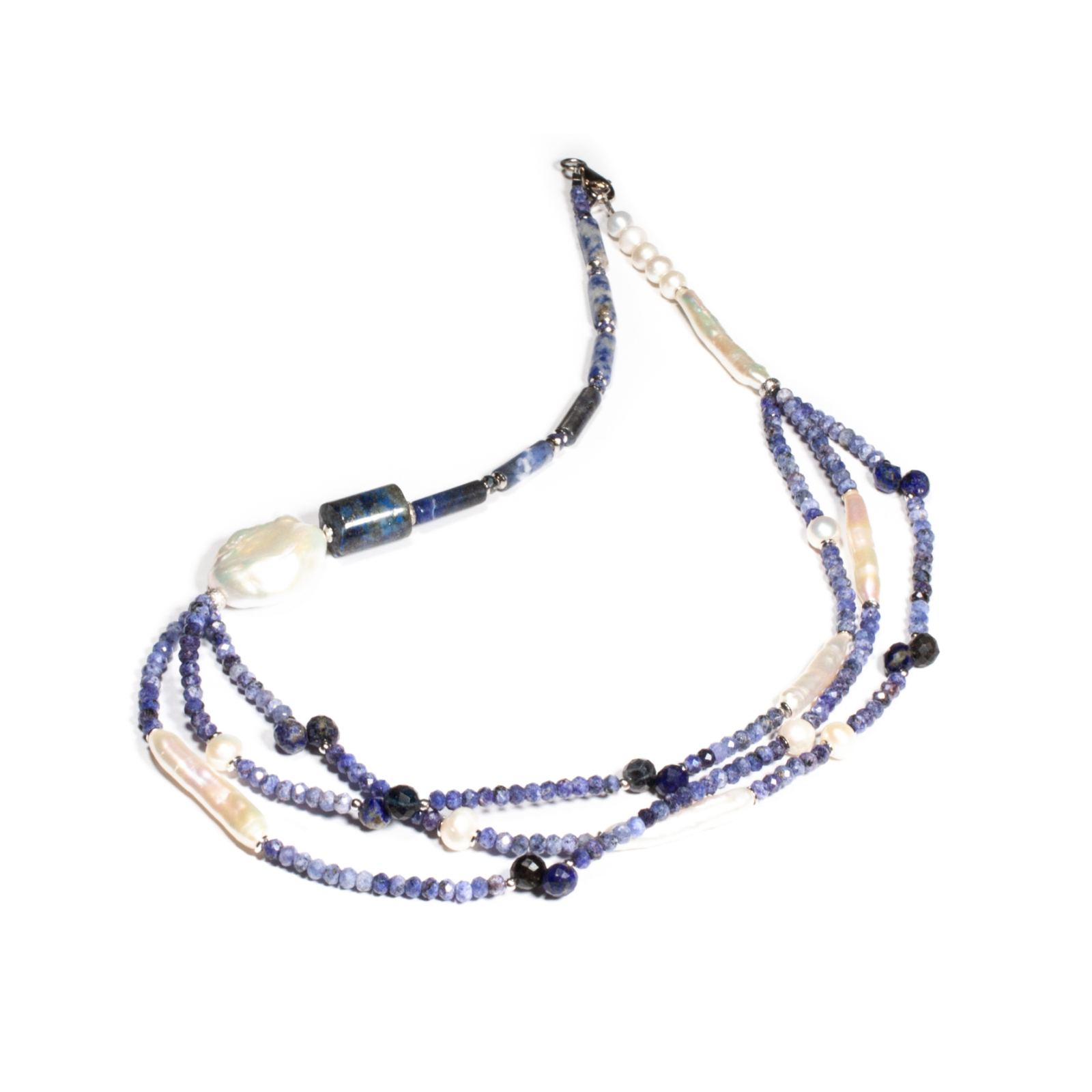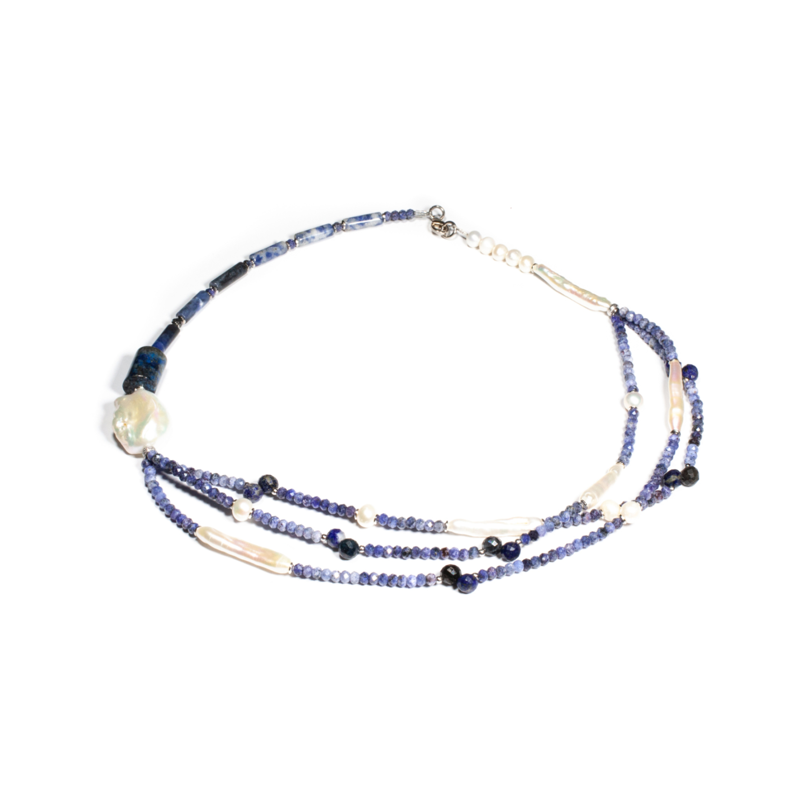 Colier unicat, concept Ioana Condurățeanu, realizat manual în atelierele Sheba din pietre naturale, cu accesorii din argint. Colierul este compus din pietre fațetate și cu tăietură caboșon de sodalit de formă sferică și cilindrică, briolete fațetate de lapis lazuli, perle de cultură de formă sferică și alungită și perlă baroc. Pietrele sunt înșirate pe suport din oțel filetat acoperit cu peliculă de protecție, special creat pentru confecționarea bijuteriilor. Sistemul de închidere este de tip carabină, discretă și sigură. O bijuterie cu personalitate, potrivită ținutelor de seară sau pentru un accent rafinat peste zi. Pentru a vă accesoriza acest colier vă puteți comanda în funcție de preferințe și ținuta la care doriți să îl purtați, cercei sau brățară în același ton.