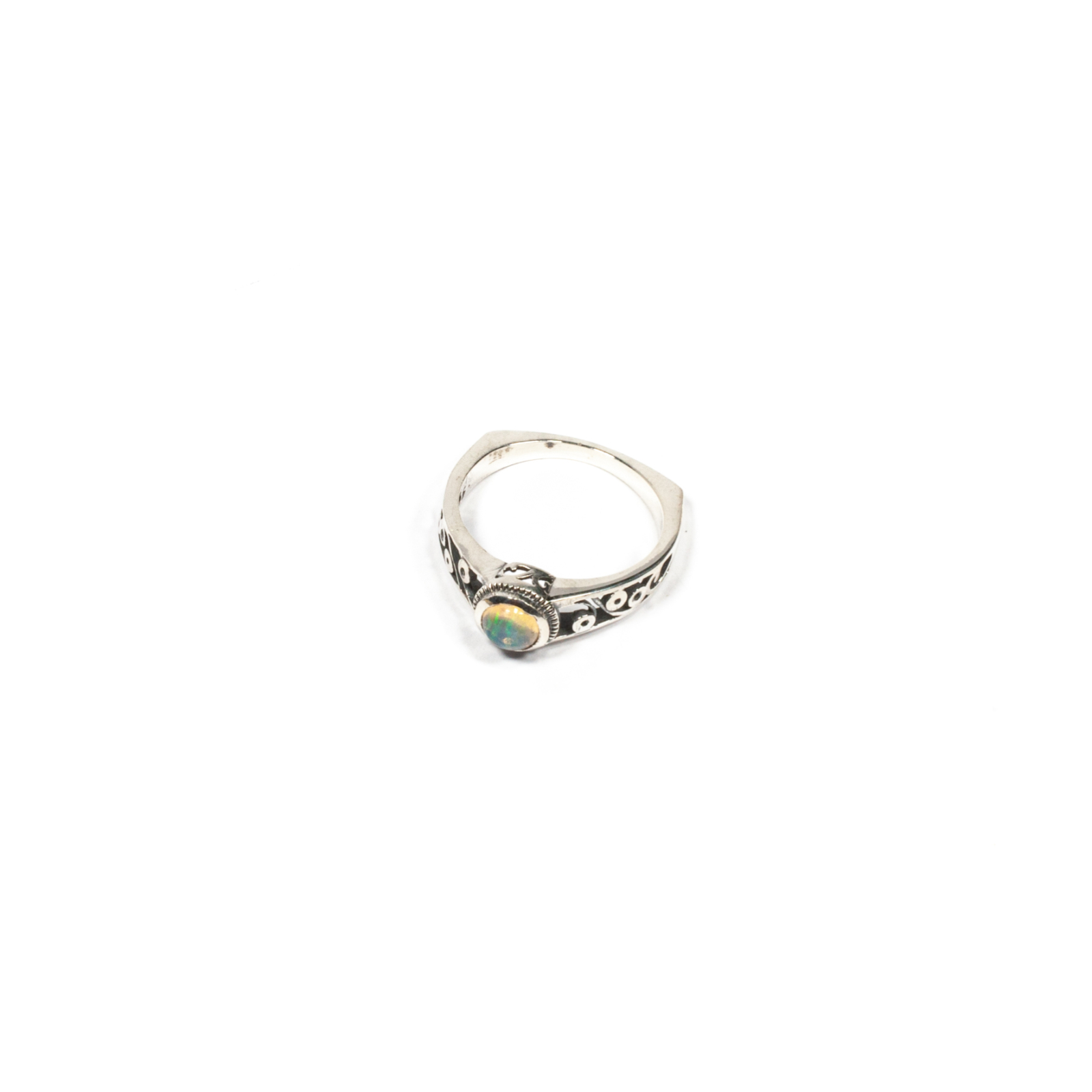 Inelul este realizat manual din argint și conține o piatră cu tăietură caboșon de opal etiopian de formă rotundă, încasetată pe contur. Designul elaborat și elegant pune în valoare culoarea naturală a pietrei, oferind o bijuterie versatilă și rafinată. Inelul conține modele reliefate scoase în evidență prin patinare. Pentru un set armonios, asortați cu un pandantiv, diferite modele sunt disponibile în colecțiile Sheba.