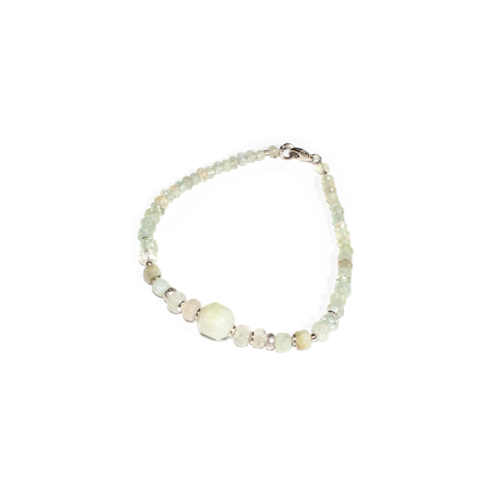 Brățară realizată manual în atelierele Sheba din pietre naturale, cu accesorii din argint. Brățara este realizată din pietre fațetate de acvamarin de formă sferă turtită și cubică. Pietrele sunt înșirate pe suport din oțel filetat acoperit cu peliculă de protecție, special creat pentru confecționarea bijuteriilor. Sistemul de prindere este tip carabină și la cerere se poate adăuga un lănțișor de prelungire. O bijuterie cu personalitate, potrivită ținutelor de seară sau pentru un accent rafinat peste zi. Pentru a vă accesoriza această brățară vă puteți comanda în funcție de preferințe și de ținuta la care doriți să o purtați, cercei sau colier în set.