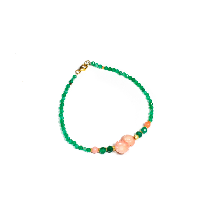 Brățară realizată manual în atelierele Sheba din pietre naturale, cu accesorii din argint auriu. Brățara este realizată din pietre fațetate de agat verde de formă sferică și ovală și din flori de coral natural ce adaugă un contrast rafinat și o notă de eleganță clasică. Accesoriile din argint auriu completează armonios designul, conferind bijuteriei un aspect sofisticat și feminin. Pietrele sunt înșirate pe suport din oțel filetat acoperit cu peliculă de protecție, special creat pentru confecționarea bijuteriilor. Sistemul de prindere este tip carabină și la cerere se poate adăuga un lănțișor de prelungire. Pentru a vă accesoriza această brățară vă puteți comanda în funcție de preferințe și de ținuta la care doriți să o purtați, cercei sau colier în set.