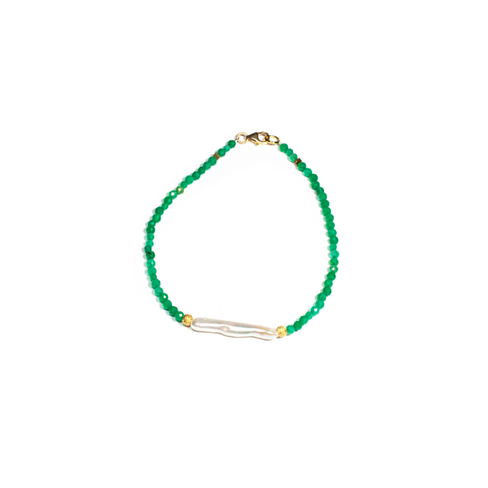 Brățară realizată manual în atelierele Sheba din pietre naturale, cu accesorii din argint auriu. Brățara este realizată din pietre fațetate de agat verde de formă sferică, iar în centrul compoziției se evidențiază o perlă de cultură cu formă organică, ce adaugă un contrast rafinat și o notă de eleganță clasică. Pietrele sunt înșirate pe suport din oțel filetat acoperit cu peliculă de protecție, special creat pentru confecționarea bijuteriilor. Sistemul de prindere este tip carabină și la cerere se poate adăuga un lănțișor de prelungire. Pentru a vă accesoriza această brățară vă puteți comanda în funcție de preferințe și de ținuta la care doriți să o purtați, cercei sau colier în set.