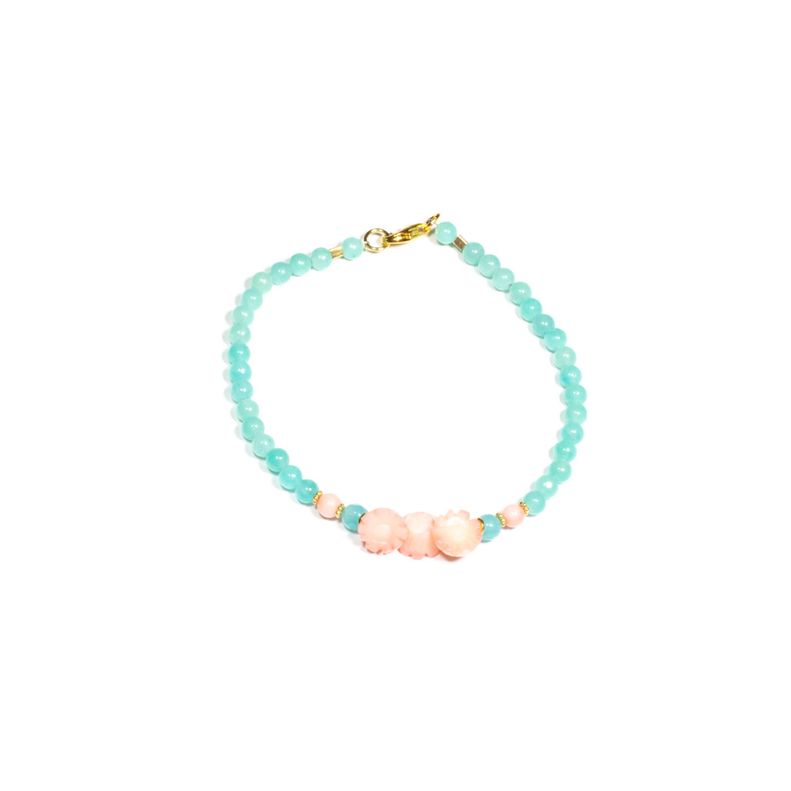 Brățară realizată manual în atelierele Sheba din pietre naturale, cu accesorii din argint auriu. Brățara este realizată din pietre cu tăietură caboșon de amazonit de formă sferică și ovală și din flori de coral natural ce adaugă un contrast rafinat și o notă de eleganță clasică. Accesoriile din argint auriu completează armonios designul, conferind bijuteriei un aspect sofisticat și feminin. Pietrele sunt înșirate pe suport din oțel filetat acoperit cu peliculă de protecție, special creat pentru confecționarea bijuteriilor. Sistemul de prindere este tip carabină și la cerere se poate adăuga un lănțișor de prelungire. Pentru a vă accesoriza această brățară vă puteți comanda în funcție de preferințe și de ținuta la care doriți să o purtați, cercei sau colier în set.
