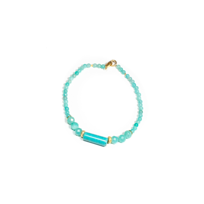 Brățară realizată manual în atelierele Sheba din pietre naturale, cu accesorii din argint auriu. Brățara este realizată din pietre fațetate de acvamarin de formă sferică, conținând o piatră dispusă central de turcoaz, de formă cilindrică. Accesoriile din argint auriu completează armonios designul, conferind bijuteriei un aspect sofisticat și feminin. Pietrele sunt înșirate pe suport din oțel filetat acoperit cu peliculă de protecție, special creat pentru confecționarea bijuteriilor. Sistemul de prindere este tip carabină și la cerere se poate adăuga un lănțișor de prelungire. Pentru a vă accesoriza această brățară vă puteți comanda în funcție de preferințe și de ținuta la care doriți să o purtați, cercei sau colier în set.