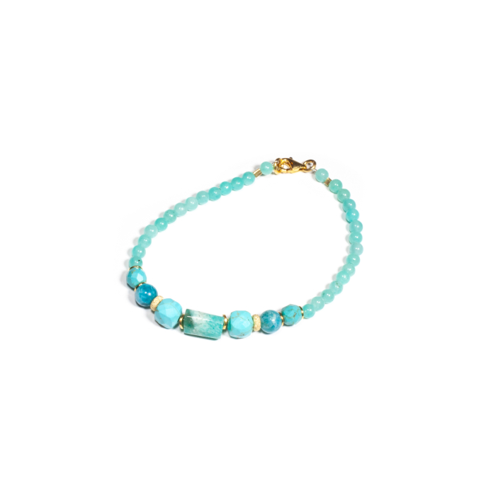 Brățară realizată manual în atelierele Sheba din pietre naturale, cu accesorii din argint auriu. Brățara este realizată din pietre cu tăietură caboșon de amazonit și ochi de șoim de formă sferică și din pietre fațetate de turcoaz de formă cubică. Accesoriile din argint auriu completează armonios designul, conferind bijuteriei un aspect sofisticat și feminin. Pietrele sunt înșirate pe suport din oțel filetat acoperit cu peliculă de protecție, special creat pentru confecționarea bijuteriilor. Sistemul de prindere este tip carabină și la cerere se poate adăuga un lănțișor de prelungire. Pentru a vă accesoriza această brățară vă puteți comanda în funcție de preferințe și de ținuta la care doriți să o purtați, cercei sau colier în set.