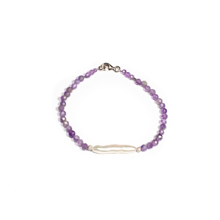 Brățară realizată manual în atelierele Sheba din pietre naturale, cu accesorii din argint. Brățara este realizată din pietre fațetate de ametist de formă sferică, iar în centrul compoziției se evidențiază o perlă de cultură cu formă organică, ce adaugă un contrast rafinat și o notă de eleganță clasică. Pietrele sunt înșirate pe suport din oțel filetat acoperit cu peliculă de protecție, special creat pentru confecționarea bijuteriilor. Sistemul de prindere este tip carabină și la cerere se poate adăuga un lănțișor de prelungire. Pentru a vă accesoriza această brățară vă puteți comanda în funcție de preferințe și de ținuta la care doriți să o purtați, cercei sau colier în set.