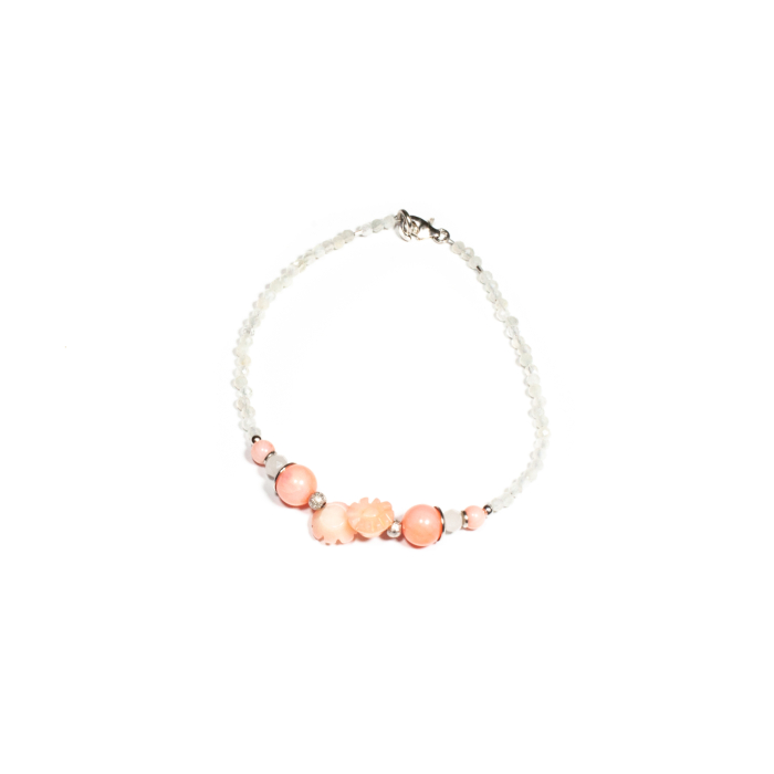 Brățară realizată manual în atelierele Sheba din pietre naturale, cu accesorii din argint. Brățara este realizată din pietre fațetate de cuarț de formă sferică și din coral natural de formă sferică și floare, ce adaugă un contrast rafinat și o notă de eleganță clasică. Pietrele sunt înșirate pe suport din oțel filetat acoperit cu peliculă de protecție, special creat pentru confecționarea bijuteriilor. Sistemul de prindere este tip carabină și la cerere se poate adăuga un lănțișor de prelungire. Pentru a vă accesoriza această brățară vă puteți comanda în funcție de preferințe și de ținuta la care doriți să o purtați, cercei sau colier în set.