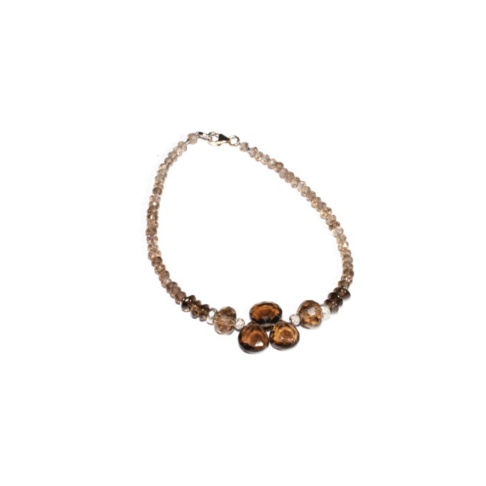 Brățară realizată manual în atelierele Sheba din pietre naturale, cu accesorii din argint. Brățara este realizată din pietre fațetate de cuarț fumuriu de formă sferă turtită și lacrimă în zona centrală. Pietrele sunt înșirate pe suport din oțel filetat acoperit cu peliculă de protecție, special creat pentru confecționarea bijuteriilor. Sistemul de prindere este tip carabină și la cerere se poate adăuga un lănțișor de prelungire. O bijuterie cu personalitate, potrivită ținutelor de seară sau pentru un accent rafinat peste zi. Pentru a vă accesoriza această brățară vă puteți comanda în funcție de preferințe și de ținuta la care doriți să o purtați, cercei sau colier în set.
