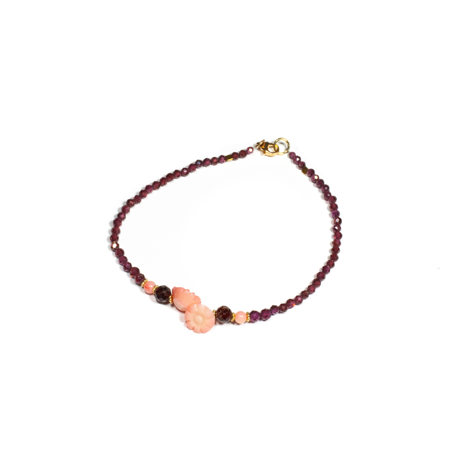 Brățară realizată manual în atelierele Sheba din pietre naturale, cu accesorii din argint auriu. Brățara este realizată din pietre fațetate de granat de formă sferică și ovală și din flori de coral natural ce adaugă un contrast rafinat și o notă de eleganță clasică. Accesoriile din argint auriu completează armonios designul, conferind bijuteriei un aspect sofisticat și feminin. Pietrele sunt înșirate pe suport din oțel filetat acoperit cu peliculă de protecție, special creat pentru confecționarea bijuteriilor. Sistemul de prindere este tip carabină și la cerere se poate adăuga un lănțișor de prelungire. Pentru a vă accesoriza această brățară vă puteți comanda în funcție de preferințe și de ținuta la care doriți să o purtați, cercei sau colier în set.
