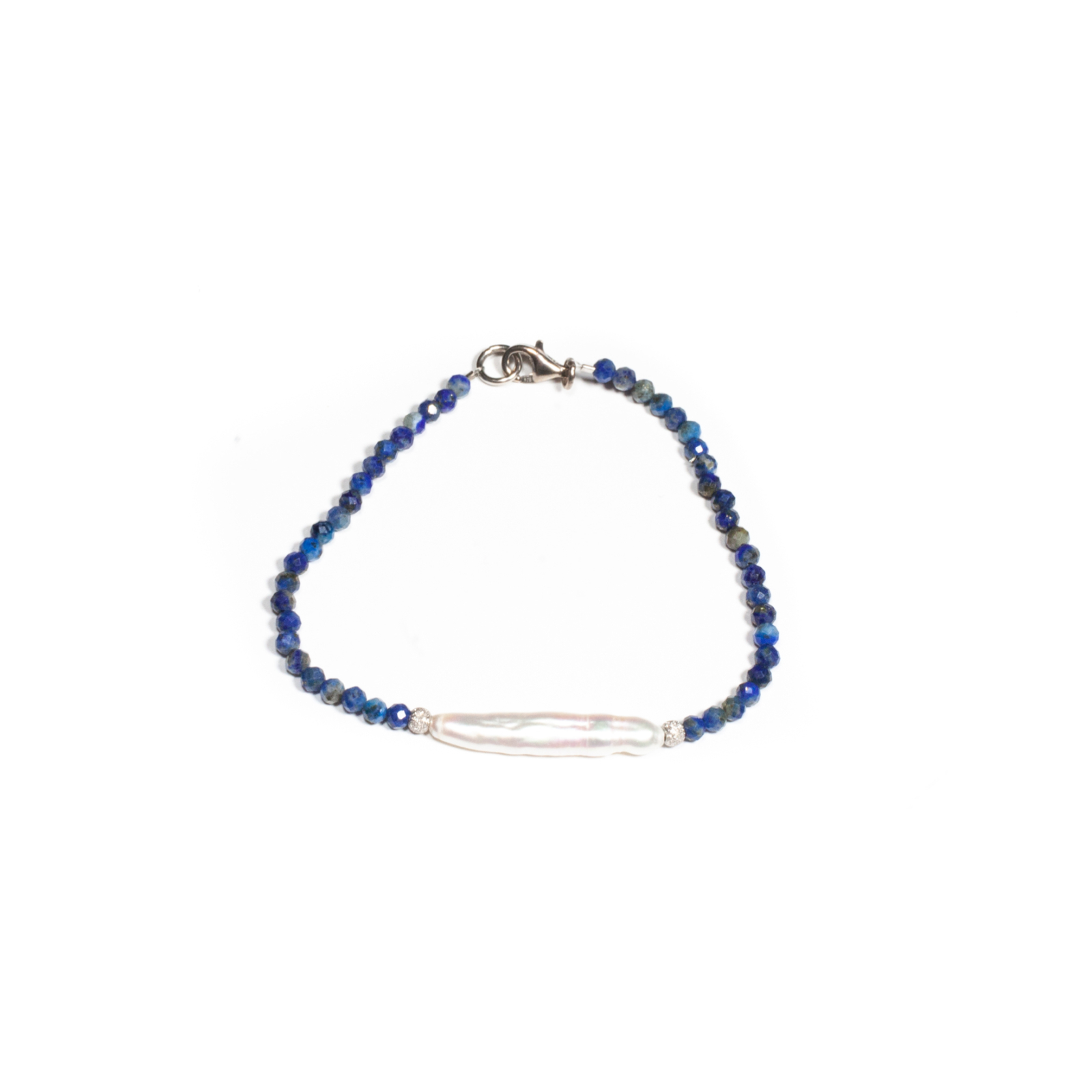 Brățară realizată manual în atelierele Sheba din pietre naturale, cu accesorii din argint. Brățara este realizată din pietre microfațetate de lapis lazuli de formă sferică, iar în centrul compoziției se evidențiază o perlă de cultură cu formă alungită, ce adaugă un contrast rafinat și o notă de eleganță clasică. Accesoriile din argint completează armonios designul, conferind bijuteriei un aspect sofisticat și feminin. Pietrele sunt înșirate pe suport din oțel filetat acoperit cu peliculă de protecție, special creat pentru confecționarea bijuteriilor. Sistemul de prindere este tip carabină și la cerere se poate adăuga un lănțișor de prelungire. Pentru a vă accesoriza această brățară vă puteți comanda în funcție de preferințe și de ținuta la care doriți să o purtați, cercei sau colier în set.