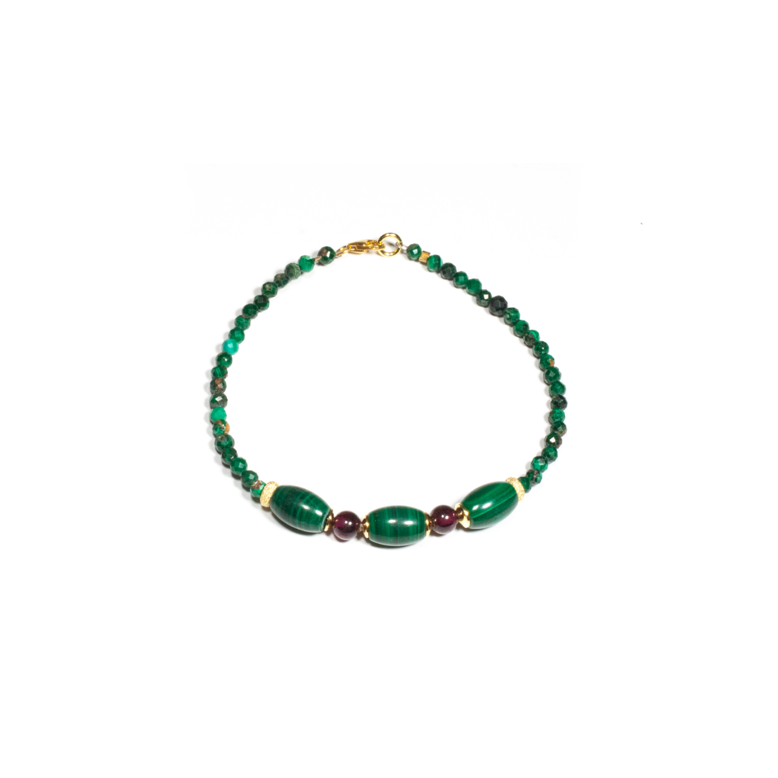 Brățară realizată manual în atelierele Sheba din pietre naturale, cu accesorii din argint auriu. Brățara este realizată din pietre fațetate și cu tăietură caboșon de malahit de formă sferică și ovală și din pietre cu tăietură caboșon de granat de formă sferică. Accesoriile din argint auriu completează armonios designul, conferind bijuteriei un aspect sofisticat și feminin. Pietrele sunt înșirate pe suport din oțel filetat acoperit cu peliculă de protecție, special creat pentru confecționarea bijuteriilor. Sistemul de prindere este tip carabină și la cerere se poate adăuga un lănțișor de prelungire. Pentru a vă accesoriza această brățară vă puteți comanda în funcție de preferințe și de ținuta la care doriți să o purtați, cercei sau colier în set.