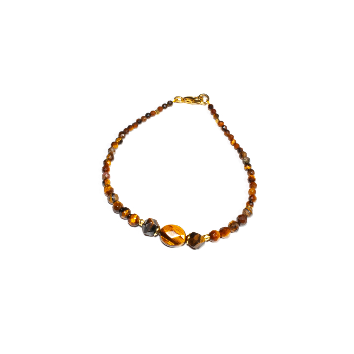 Brățară unicat, concept Ioana Condurățeanu, realizată manual în atelierele Sheba din pietre naturale, cu accesorii din argint auriu. Brățara este compusă din pietre fațetate de ochi de tigru de formă sferică și ovală. Pietrele sunt înșirate pe suport din oțel filetat acoperit cu peliculă de protecție, special creat pentru confecționarea bijuteriilor. Sistemul de închidere este de tip carabină, discretă și sigură. O bijuterie cu personalitate, potrivită ținutelor de seară sau pentru un accent rafinat peste zi. Pentru a vă accesoriza această brățară vă puteți comanda în funcție de preferințe și de ținuta la care doriți să o purtați, cercei sau colier în set.