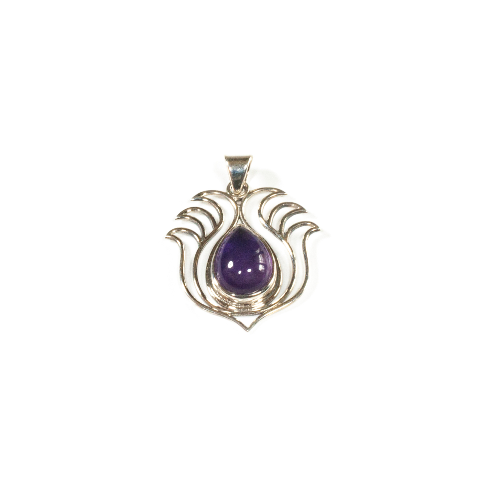 Pandantiv confecționat din argint cu design stilizat cu linii fluide, ce conturează elegant o piatră cu tăietură caboșon de ametist, de formă lacrimă, încasetată pe contur. Montura este realizată manual, de artizani din Bali, renumiți pentru măiestria lor în confecționarea bijuteriilor. Designul simplu și elegant pune în valoare culoarea naturală și strălucirea pietrei, oferind o bijuterie versatilă și rafinată. Pentru un efect stilistic complet, puteți accesoriza acest pandantiv cu cercei sau o brățară în același ton, disponibile în colecțiile Sheba. De asemenea, puteți alege și un lanț potrivit pentru acest pandantiv.