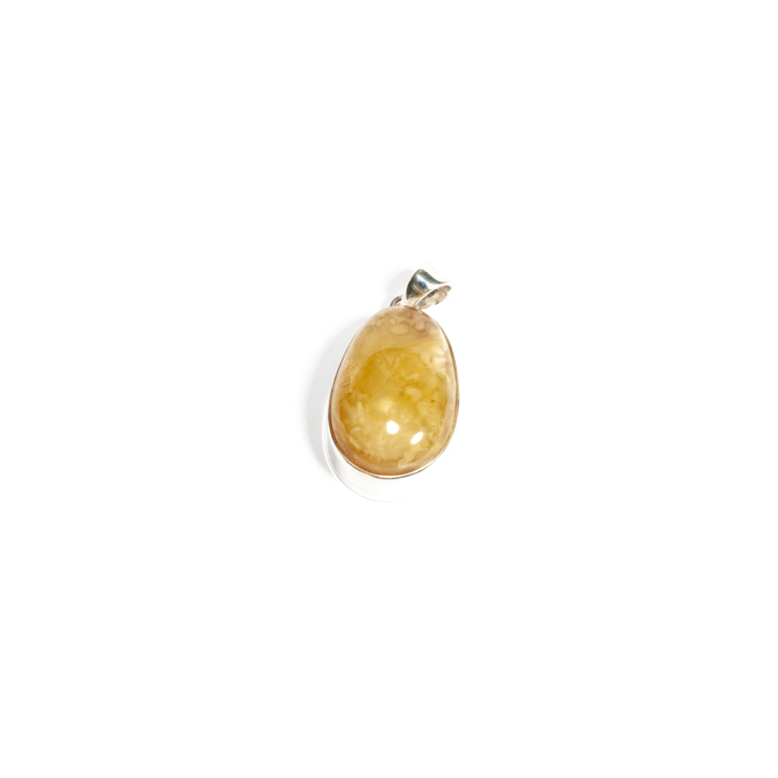 Pandantiv realizat manual din argint ce conține o piatră cu tăietură caboșon de chihlimbar de formă ovală, încasetată pe contur. Designul simplu și elegant pune în valoare culoarea naturală a pietrei, oferind o bijuterie versatilă și rafinată. Pentru un ansamblu complet, puteți opta pentru cercei sau brățară asortate, disponibile în colecțiile Sheba. De asemenea, puteți alege și un lanț potrivit pentru acest pandantiv.