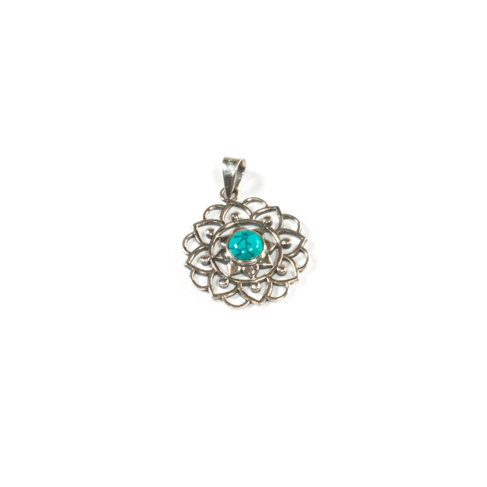 Pandantiv confecționat din argint în formă de rozetă stilizată cu motive florale ce conține o piatră cu tăietură caboșon de howlit, de formă rotundă, încasetată pe contur. Designul floral, delicat și armonios, împreună cu finisajul elegant, îl fac potrivit pentru orice ținută. Montura este realizată manual, de artizani din Bali, renumiți pentru măiestria lor în confecționarea bijuteriilor. Pentru un efect stilistic complet, puteți accesoriza acest pandantiv cu cercei sau o brățară în același ton, disponibile în colecțiile Sheba. De asemenea, puteți alege și un lanț potrivit pentru acest pandantiv.
