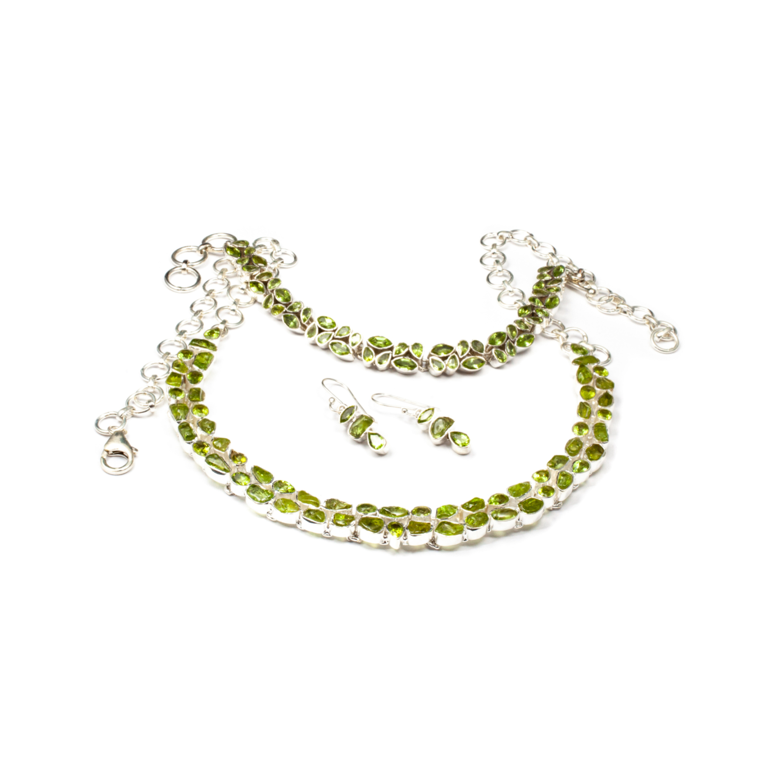 Set unicat din argint cu pietre naturale. Colierul, brățara și cerceii sunt compuse din pietre fațetate de peridot de formă lacrimă și ovală, încasetate pe contur. Finisajul impecabil, realizat manual cu atenție la detalii evidențiază irizațiile delicate ale pietrelor. Este un set statement, rafinat și diafan, potrivit pentru ocazii elegante sau pentru a aduce o notă subtilă de feminitate în ținutele de zi. Colierul și brățara dispun de lanț de prelungire pentru ajustarea lungimii după preferință. Cerceii sunt prevăzuți cu sistem de prindere pe ureche tip tortiță deschisă, astfel se așază perfect pe lob și sunt comod de purtat. Pentru completarea setului, consilierii Sheba vă pot oferi asistență, în limita disponibilității.