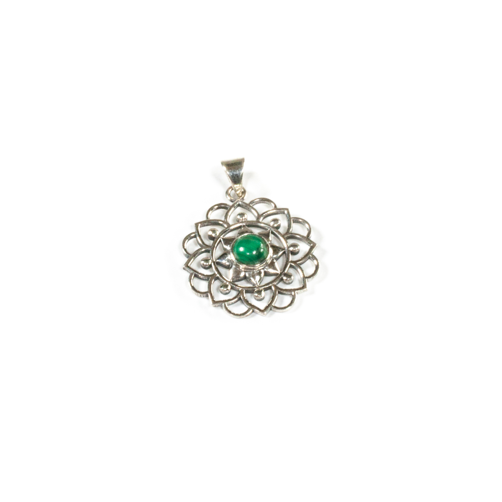 Pandantiv confecționat din argint în formă de rozetă stilizată cu motive florale ce conține o piatră cu tăietură caboșon de malahit, de formă rotundă, încasetată pe contur. Designul floral, delicat și armonios, împreună cu finisajul elegant, îl fac potrivit pentru orice ținută. Montura este realizată manual, de artizani din Bali, renumiți pentru măiestria lor în confecționarea bijuteriilor. Pentru un efect stilistic complet, puteți accesoriza acest pandantiv cu cercei sau o brățară în același ton, disponibile în colecțiile Sheba. De asemenea, puteți alege și un lanț potrivit pentru acest pandantiv.